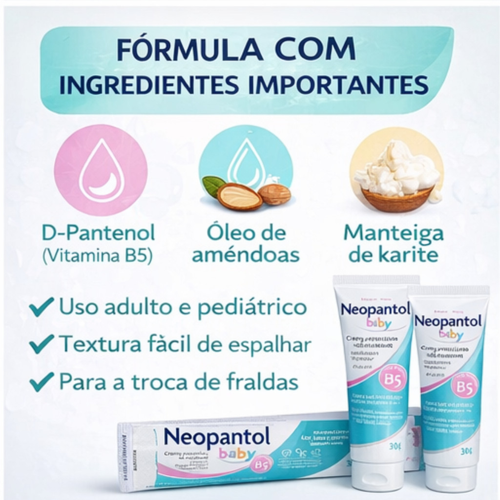 O Neopantol Baby Creme Preventivo de Assaduras 30g Neo Química foi desenvolvido para o cuidado diário da pele do bebê, formando uma camada protetora que auxilia na proteção contra o contato prolongado com a umidade; sua fórmula contém D-Pantenol (Vitamina B5), óleo de amêndoas e manteiga de karité, sendo indicado para uso preventivo em trocas de fraldas, com textura fácil de espalhar e adequada para uso adulto e pediátrico conforme orientação do fabricante. Medidas do item: bisnaga com 30gMaterial/Composição: D-Pantenol (Vitamina B5), óleo de amêndoas, manteiga de karité Estoque limitado! Garanta agora o cuidado diário para a pele do bebê.Imagens Meramente Ilustrativas. Todas as Informações Divulgadas são de Responsabilidade Exclusiva do Fabricante/fornecedor.