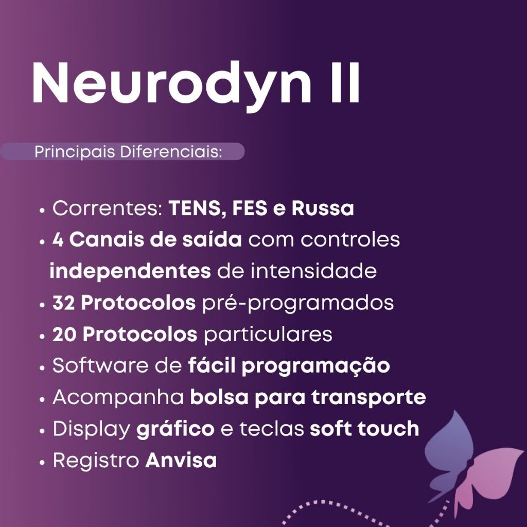 Neurodyn II 4 Canais - Aparelho de Corrente Tens, Fes e Russa O Neurodyn II é um equipamento para aplicação de corrente elétrica via eletrodos em contato direto com o paciente para terapia de disfunções neuromusculares com as correntes TENS, FES e Russa. O eletroestimulador possui quatro canais com ajuste de intensidade independentes. Indicações das Correntes: Corrente FES (Estimulação Elétrica Funcional): É indicada para prevenção ou tratamento de atrofia por desuso, aumento da circulação sanguínea local, reeducação muscular, manutenção ou aumento da amplitude de movimento e relaxamento de músculos espásticos. Corrente TENS (Estimulação Elétrica Transcutânea): É indicada para alívio sintomático e tratamento da dor crônica, aumento da circulação sanguínea local, alívio sintomático dor pós-traumática aguda e dor pós-operatória aguda. Corrente Russa (Corrente de Média Frequência modulada em Burst): É indicada para produção de fortalecimento muscular, prevenção e tratamento de atrofia muscular, aumento da circulação sanguínea local, de forma confortável para o paciente. Tipos de Correntes Disponíveis no Neurodyn II - TENS: convencional, acupuntura e breve intensa - TENS VIF: com variação automática de intensidade e frequência - TENS B: BURST, modulado em trens de pulso a 2Hz - FES S: sincronizado - FES R: recíproco - FES S VIF: sincronizado com variação automática de intensidade e frequência - FES R VIF: recíproco com variação automática de intensidade e frequência - Corrente Russa: Modos contínuo, sincronizado e recíproco Indicações do Neurodyn II Correntes Russa e FES - Prevenção ou tratamento de atrofia por desuso - Aumento da circulação sanguínea local - Reeducação muscular - Manutenção ou aumento da amplitude de movimento - Relaxamento de músculos espásticos Corrente TENS: - Alívio sintomático e tratamento da dor crônica - Aumento da circulação sanguínea local - Alívio sintomático da dor pós-traumática aguda - Alívio sintomático da dor pós-operatória aguda Contraindicações do Neurodyn II - Gestantes ou intenção de engravidar - Dispositivo eletrônico implantado (ex.: marca-passo cardíaco, dispositivo de estimulação cerebral profunda etc.) - Não deve ser utilizado para o alívio da dor local sintomática sem etiologia conhecida, a menos que uma síndrome de dor for diagnosticada - Em pacientes com suspeita de doenças infecciosas transmissíveis e/ou doenças em que é aconselhado, para fins médicos, suprimir calor ou febres - Sobre os nervos do seio carotídeo, particularmente em pacientes com sensibilidade alterada ao reflexo do seio carotídeo - Sobre o pescoço ou boca. Espasmos dos músculos da laringe e da faringe podem ocorrer e as contrações podem promover o fechamento das vias aéreas ou causar dificuldades respiratórias - Sobre a área cardíaca, pois pode provocar arritmias cardíacas - A estimulação não deve ser aplicada na região do cérebro - Sobre as áreas inchadas, infectadas ou inflamadas, ou sobre erupções da pele, tais como flebite, tromboflebite, varizes etc - Sobre ou próximo a lesões cancerígenas - Sobre áreas com implantes metálicos Dados Técnicos: - Marca: Ibramed - Modelo: Neurodyn II - Terapia: Eletroestimulação - Correntes: TENS, FES e Russa - Modo: TENS e FES: Vf, Vif, Ac, Busrt / Russa: Contínuo, Pulsado, Sincronizado e Recíproco - Bivolt: 100-2A0 Volts ~ 60 Hertz - Canais de saída: 2 saídas para 4 canais independentes - Protocolos: 32 programados e 20 particulares - Intensidade: 0 a 250 mA - Pulso: 25 a 500 us - Frequência: 0,5 a 250 Hz - Dimensões: 27 cm x 26,6 cm x 12,5 cm (L x P x A) - Peso aproximado, sem acessórios: 1,85 kg - Registro Anvisa nº 10360310009 - Garantia: 18 meses contra defeitos de fabricação Itens Inclusos: 01 Aparelho Neurodyn II 01 Kit de cabo azul e verde 09 com duas vias cada 01 Kit de cabo preto e laranja 38 com duas vias cada 08 Eletrodos de borracha condutiva de 5 cm x 5 cm 01 Cabo de força destacável (PP fêmea IEC de 2 x 0,75 X 1500 mm) 01 Bolsa para transporte linha Safira 01 Tubo de gel clínico RMC 100g (registro Anvisa nº 80122200001) 01 Fusível de proteção sobressalente 20AG de 5A 01 Cartela de fusível de proteção 01 Acesso ao Manual de operações digital * 01 Gel 1KG – a marca será enviada conforme disponibilidade de estoque (Multigel ou RMC) 08 Eletrodos autocolantes 5x5cm 02 Faixas 60cm DÚVIDAS? FAÇA SUA PERGUNTA ABAIXO! SERÁ UM PRAZER LHE ATENDER!