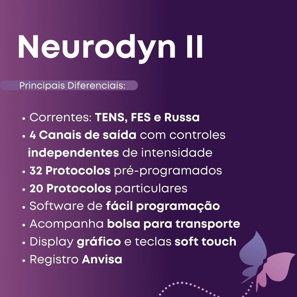 Neurodyn II 4 Canais – Aparelho de Correntes TENS, FES e Russa – Ibramed O Neurodyn II é um equipamento de eletroestimulação indicado para tratamentos de disfunções neuromusculares, utilizando as correntes TENS, FES e Russa. Possui quatro canais com ajuste de intensidade independentes, oferecendo alta versatilidade para consultórios e atendimentos home care. - DIFERENCIAIS DO NEURODYN II > 4 canais de saída independentes com controle individual de intensidade. > Protocolos programados e particulares: 32 programados e 20 configuráveis. > Equipamento para aplicação das correntes TENS, FES e Russa. > Modos de corrente variados, incluindo VIF, Burst, sincronizado e recíproco. > Design compacto e moderno. > Operação Bivolt automática. * Inclusão de kit exclusivo HSMED: 12 eletrodos autoadesivos + 01 gel 1KG + 02 faixas elásticas 60 cm + 08 eletrodos 5x5 cm + 01 bolsa de transporte + treinamento online. - INDICAÇÕES DO NEURODYN II Correntes FES e Russa: > Prevenção ou tratamento de atrofia por desuso. > Aumento da circulação sanguínea local. > Reeducação e fortalecimento muscular. > Manutenção ou aumento da amplitude de movimento. > Relaxamento de músculos espásticos. Corrente TENS: > Alívio sintomático e tratamento da dor crônica. > Aumento da circulação sanguínea local. > Alívio da dor pós-traumática aguda. > Alívio da dor pós-operatória aguda. - TIPOS DE CORRENTES DISPONÍVEIS > TENS: convencional, acupuntura e breve intensa > TENS VIF: variação automática de intensidade e frequência > TENS B: BURST, modulado em trens de pulso a 2 Hz > FES S: sincronizado > FES R: recíproco > FES S VIF: sincronizado com variação automática > FES R VIF: recíproco com variação automática > Corrente Russa: contínuo, sincronizado e recíproco - MODOS DE USO > Seleção manual: escolha livre da corrente e parâmetros. > Protocolos programados: aplicação imediata. > Particular: até 20 modos configuráveis para personalizar terapias. - CONTRAINDICAÇÕES DO NEURODYN II > Gestantes ou mulheres com intenção de engravidar. > Pacientes com dispositivos eletrônicos implantados (marca-passo, neuroestimulador, etc.). > Uso para dor sem diagnóstico definido. > Sobre nervos do seio carotídeo, pescoço, boca ou região cardíaca. > Sobre cérebro, áreas inflamadas, inchadas ou cancerígenas. > Sobre áreas com implantes metálicos. - DADOS TÉCNICOS > Marca: Ibramed > Modelo: Neurodyn II > Terapia: Eletroestimulação (TENS, FES e Russa) > Modos: TENS e FES (Vf, VIF, Ac, Burst), Russa (Contínuo, Pulsado, Sincronizado e Recíproco) > Alimentação: Bivolt 100-240 V ~ 60 Hz > Canais de saída: 2 saídas para 4 canais independentes > Intensidade: 0 a 250 mA > Pulso: 25 a 500 μs > Frequência: 0,5 a 250 Hz > Dimensões: 27 × 26,6 × 12,5 cm (L × P × A) > Peso aproximado: 1,85 kg > Registro Anvisa: 10360310009 > Garantia: 18 meses - ITENS INCLUSOS 01 Aparelho Neurodyn II 01 Kit de cabo azul e verde com duas vias cada 01 Kit de cabo preto e laranja com duas vias cada 08 Eletrodos de borracha condutiva 5x5 cm 01 Cabo de força destacável 01 Tubo de gel clínico RMC 100g 01 Fusível de proteção sobressalente 20AG de 5A 01 Cartela de fusível de proteção 01 Manual de operações digital 01 Bolsa de transporte Safira 02 Faixas elásticas para fixação de eletrodos – 60 cm 12 Eletrodos autoadesivos 5x5 cm * 01 Gel 1KG – a marca será enviada conforme disponibilidade de estoque (Multigel ou RMC)