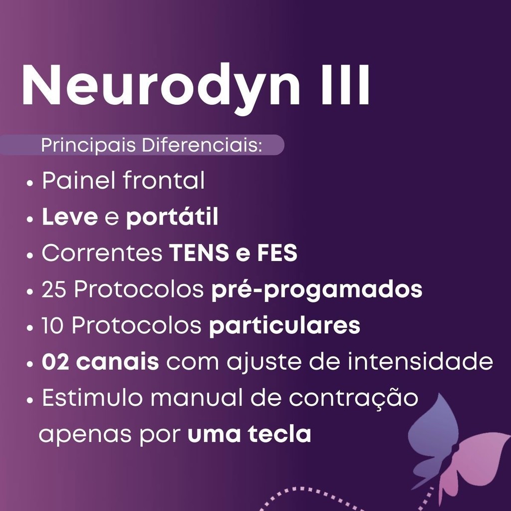 Neurodyn Iii Ibramed Novo Modelo Tens Fes Burst 02 Canais KIT EXCLUSIVO HSMED: 12 ELETRODOS AUTOADESIVOS + 01 GEL 1KG + 02 FAIXAS ELÁSTICAS 60CM + 04 ELETRODOS 5X5CM + 01 TREINAMENTO EXCLUSIVO ONLINE!! O Neurodyn III é um equipamento microcontrolado para aplicação de corrente elétrica via eletrodos em contato direto com o paciente para terapias de disfunções neuromusculares. Possui as correntes TENS e FES. A técnica consiste na aplicação de suave estimulação elétrica através de eletrodos colocados em áreas corporais afetadas pela dor (TENS), ou ativar os músculos esqueléticos e produzir movimentos (FES). A intensidade da corrente necessária ao tratamento varia com o tipo de disfunção que será tratada bem como com o limiar de sensibilidade de cada paciente, e é por isso que o tratamento deve iniciar com níveis de intensidades mais baixos, aumentando cuidadosamente de acordo com a resposta sensorial, motora e dolorosa referida pelo paciente. Com o Neurodyn III é possível trabalhar nos seguintes modos de operação: TENS convencional, TENS VIF, TENS Burst, FES Sincronizado, FES Recíproco, FES Sincronizado VIF, FES Recíproco VIF. DIFERENCIAIS: - 25 Protocolos pré-progamados e 10 particulares que permitem a armazenagem de programa de tratamentos mais utilizados - Tecla MS: Possibilita gerar um estimulo manual de contração apenas por uma tecla - Possui dois canais com ajuste de intensidade independente em um único conector DB9 - Amplamente utilizado na área de fisioterapia ortopédica, traumatológica, reumatológica, neurológica e desportiva, promovendo analgesia e fortalecimento muscular - Programação via teclado: Gera informações digitalizadas e oferece confiabilidade nos dados - Painel frontal: Facilita a visualização e possibilita ao terapeuta ajustar facilmente o aparelho, além de design moderno do equipamento - Leve e pequeno: Nos casos de atendimentos domiciliares, pode ser facilmente transportado - Versatilidade: Possibilita a aplicação de correntes TENS e FES em um mesmo equipamento INDICAÇÕES: TENS: - Dores Pós-Operatórias - Dores Cervicais, Cervicobraquialgias - Dores Lombares, Ciatalgias - Dores de Cabeça, Face, Dentais e de ATM - Dores Articulares, Artrites, Bursites, Luxações e Entorses - Dores Musculares, Contusões, Miosites, Tendinites, Miofaciais - Dores de Câncer - Dores Viscerais Abdominais - Dores nas Costas e Torácicas - Dores no Coto de Amputação e em Membros Fantasma - Dores Talâmicas e das Lesões Medulares - Neuropatias e Neurites, Occipital, Pós-Herpética, Trigeminal, Diabética e Traumática, Distrofias Simpático Reflexas, Causalgias FES: - Facilitação Neuromuscular - Fortalecimento Muscular - Ganhar ou manter amplitude de movimento articular - Combater contraturas e tecidos moles - Controlar a Espasticidade - Para uso como uma Órtese CONTRAINDICAÇÕES: - Gravidez - Pacientes Cardíacos - Equipamentos de monitoração - Dispositivo Eletrônico Implantado - Crianças, pacientes senis e epiléticos - Não Estimular Sobre os Seios Carotídeos - Não Aplicar em Dores Não Diagnosticadas - Não coloque os eletrodos sobre a boca ou pescoço - Estimular Com Intensidades Reduzidas as Regiões do Pescoço e da Boca - Quando o paciente estiver sendo monitorado por monitor cardíaco ou qualquer outro tipo de monitoração eletrônica INFORMAÇÕES TÉCNICAS: Marca: Ibramed Modelo: Neurodyn III - 2 Canais Material: Metal e Polipropileno Voltagem: Bivolt (automático) Dimensões: 15 x 18,5 x 9,5 cm (L x P x A) Peso: 0,8 Kg Registro Anvisa: 10360310012 Garantia: 18 meses ITENS INCLUSOS: 01 Neurodyn III Ibramed - Aparelho De Tens, Fes E Burst 02 Canais 01 Cabo para eletroestimulação (Preto 2 vias/Laranja 2 vias) 04 Eletrodos de silicone 3cm x 5cm 01 Bisnaga de gel 100g 01 Bolsa para transporte 01 Cabo de força 01 Acesso ao Manual de Operações Digital IBRAMED * 01 Gel 1KG – marca enviada conforme disponibilidade de estoque. 02 Faixas Elásticas Para Fixação de Eletrodos - 60cm 12 Eletrodos Autoadesivos 5x5cm APROVEITE! OFERTA POR TEMPO LIMITADO! DÚVIDAS? FAÇA SUA PERGUNTA ABAIXO! SERÁ UM PRAZER LHE ATENDER!
