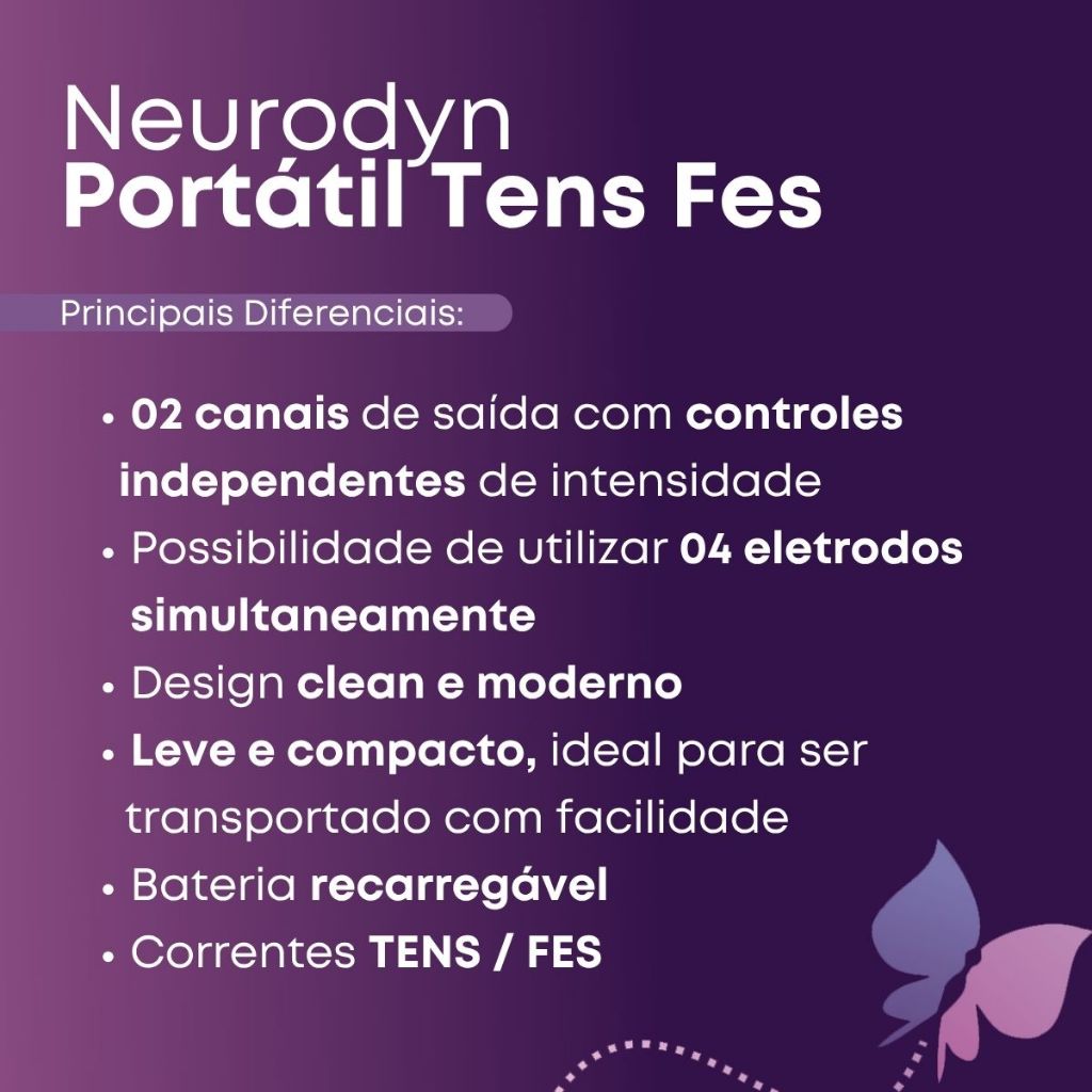 Novo Neurodyn Portátil TENS/FES 02 Canais – Aparelho de Eletroestimulação Ibramed O Novo Neurodyn Portátil TENS pode ser operado com bateria de 9V ou conectado à rede elétrica, promovendo maior versatilidade aos atendimentos. O aparelho possui 02 canais de saída com controles independentes de intensidade, teclas de disparo manual para a corrente TENS e para transporte. Associado ao seu design compacto e interface intuitiva, o Novo Neurodyn Portátil leva praticidade ao dia-a-dia do profissional e é ideal para atendimentos HOME CARE. DIFERENCIAIS E BENEFÍCIOS - 02 canais de saída com controles independentes de intensidade - Possibilidade de utilizar 04 eletrodos simultaneamente - Design clean e moderno - Leve e compacto ideal para ser transportado com facilidade - Teclas de disparo manual - Bateria recarregável INDICAÇÕES Corrente TENS - Alívio sintomático e tratamento de dor crônica - Aumento da circulação sanguínea local - Alívio sintomático dor pós-traumática aguda - Dor pós-operatória aguda - Dor muscular - Entorses e luxações - Estimulo da circulação sanguínea Corrente FES - Reeducação muscular - Aumento da circulação sanguínea local - Relaxamento de espasmo muscular - Tensão e contratura muscular - Bloqueio e rigidez articular - Tratamento de cicatrizes - Redução de inchaço EFEITOS FISIOLÓGICOS Corrente TENS na Fisioterapia A forma de onda simétrica bifásica tem uma duração de pulso curto e é capaz de estimular fortemente fibras nervosas na pele e/ou no músculo. A TENS é uma corrente clássica no tratamento da dor via estimulação sensorial, e o estímulo é bem tolerado pelo paciente, mesmo em intensidades relativamente elevadas. Essa corrente é ideal para protocolos com objetivo analgésico, para alívio sintomático da dor aguda e crônica intratável, aumento a circulação sanguínea local e alívio sintomático da dor pós-traumática. Corrente FES na Fisioterapia A corrente FES usa estímulos elétricos de baixa frequência para produzir movimentos funcionais ou séries de movimentos perdidos por lesões e/ou comprometimento do sistema nervoso. Dessa forma, essa corrente é altamente indicada em tratamentos com foco em reabilitação, porque promove a despolarização do neurônio motor, produzindo contração eficiente no músculo, aumento do metabolismo celular, aumento da oxigenação, a liberação de metabólitos e aumento da circulação sanguínea e tônus muscular. MODOS DE OPERAÇÃO - TENS: modo normal (TENS: convencional) - TENS Vf: (TENS com variação automática de frequência) - TENS Vif (TENS com variação automática de intensidade e frequência) - TENS Ac (TENS Acupuntura) - BURST (TENS modulado em trens de pulso a 2Hz) - FES SYNC (FES sincronizado) - FES REC (FES recíproco) - FES SYNC Vif (FES sincronizado com variação automática de intensidade e frequência) - FES REC Vif (FES recíproco com variação automática de intensidade e frequência) ESTIMUALAÇÃO MANUAL O Neurodyn Portabe TENS/ FES também possibilita a Estimulação Manual (MS) para as modalidades Fes Sync (Sincronizada Fes), Fes Sync VIF (Sincronizada Fes com Vif), Fes Rec (Recíproca Fes) ou Fes Rec Vif (Recíproca Fes com Vif). CONTRAINDICAÇÕES - Dispositivo eletrônico implantado; - Pacientes cardíacos; - Próteses metálicas; - Gravidez; - Cuidado nas aplicações em crianças, pessoas senis e epiléticos; - Pessoas com aversão ao uso de correntes elétricas. DADOS TÉCNICOS - Bivolt 127/220V | 50/60Hz; - Canais de saída: 2 canais independentes em amplitude; - Dimensões: (14 x 8 x 4) C x L x A - Peso: 0.2 kg - Registro ANVISA: 10360310012 - Tempo regulável: 01 a 60 minutos - Bateria 9V recarregável ITENS INCLUSOS: 01 Neurodyn Portátil TENS FES Ibramed 01 Fonte de alimentação 02 Cabos de eletroestimulação branco 2 vias 01 Bateria 04 Eletrodos de borracha condutiva 5x5cm 01 Acesso ao manual de operações 01 Bisnaga de gel 100g * 01 Gel 1KG – a marca será enviada conforme disponibilidade de estoque (Multigel ou RMC) 08 Eletrodos autoadesivos 5x5cm APROVEITE! OFERTA POR TEMPO LIMITADO! DÚVIDAS? FAÇA SUA PERGUNTA ABAIXO! SERÁ UM PRAZER LHE ATENDER!