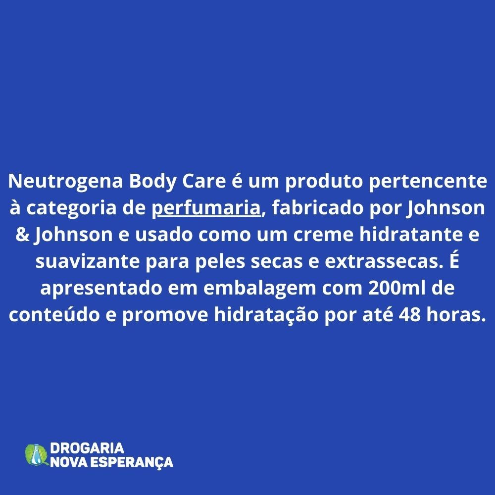 Neutrogena Body Care com 200ml é um produto que auxilia com: - A hidratação e suavização corporal, incluindo peles secas, extrassecas e delicadas. Com duração de até 48 horas.