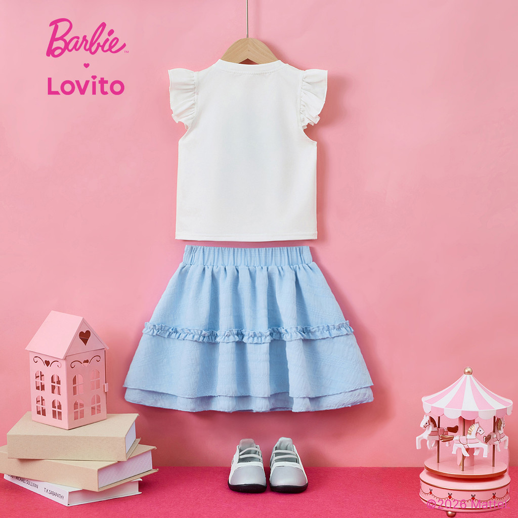 (New arrival) Barbie™ X Lovito Kids Conjunto Saia Fofa Laço Babados Amarração Azul Primavera/Verão Meninas KSBL3PAD057