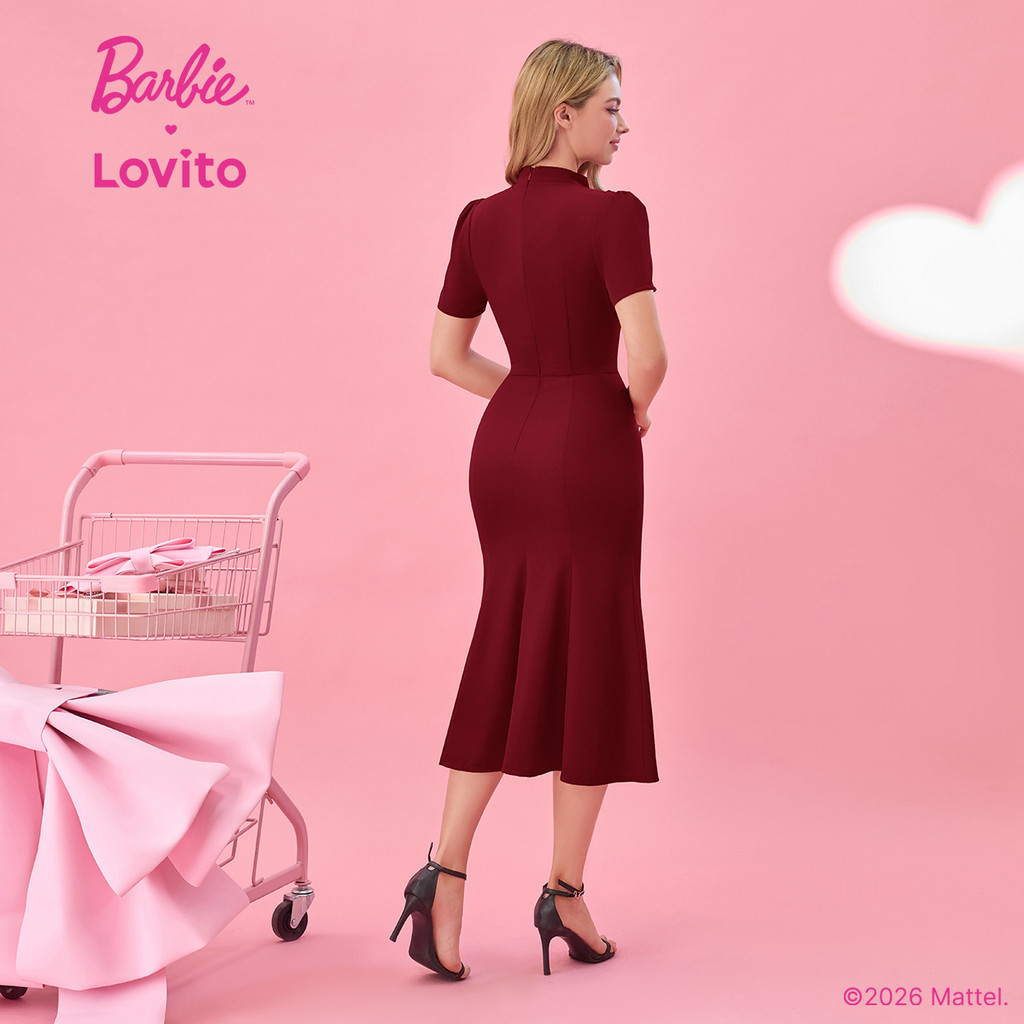 (New arrival) Barbie™ X Lovito Vestido Casual Babado Bainha Laço Frontal Primavera/Verão Clarete Mulheres DRBL2PAD046