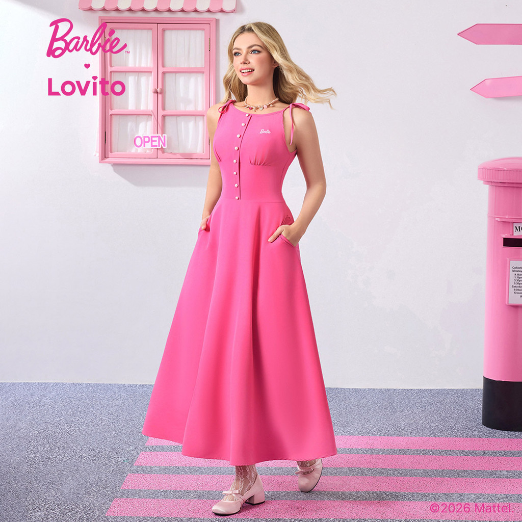 (New arrival) Barbie™ X Lovito Vestido Casual Botão Frente Babado Bainha Rosa Vermelha Mulheres DRBL3PAD039