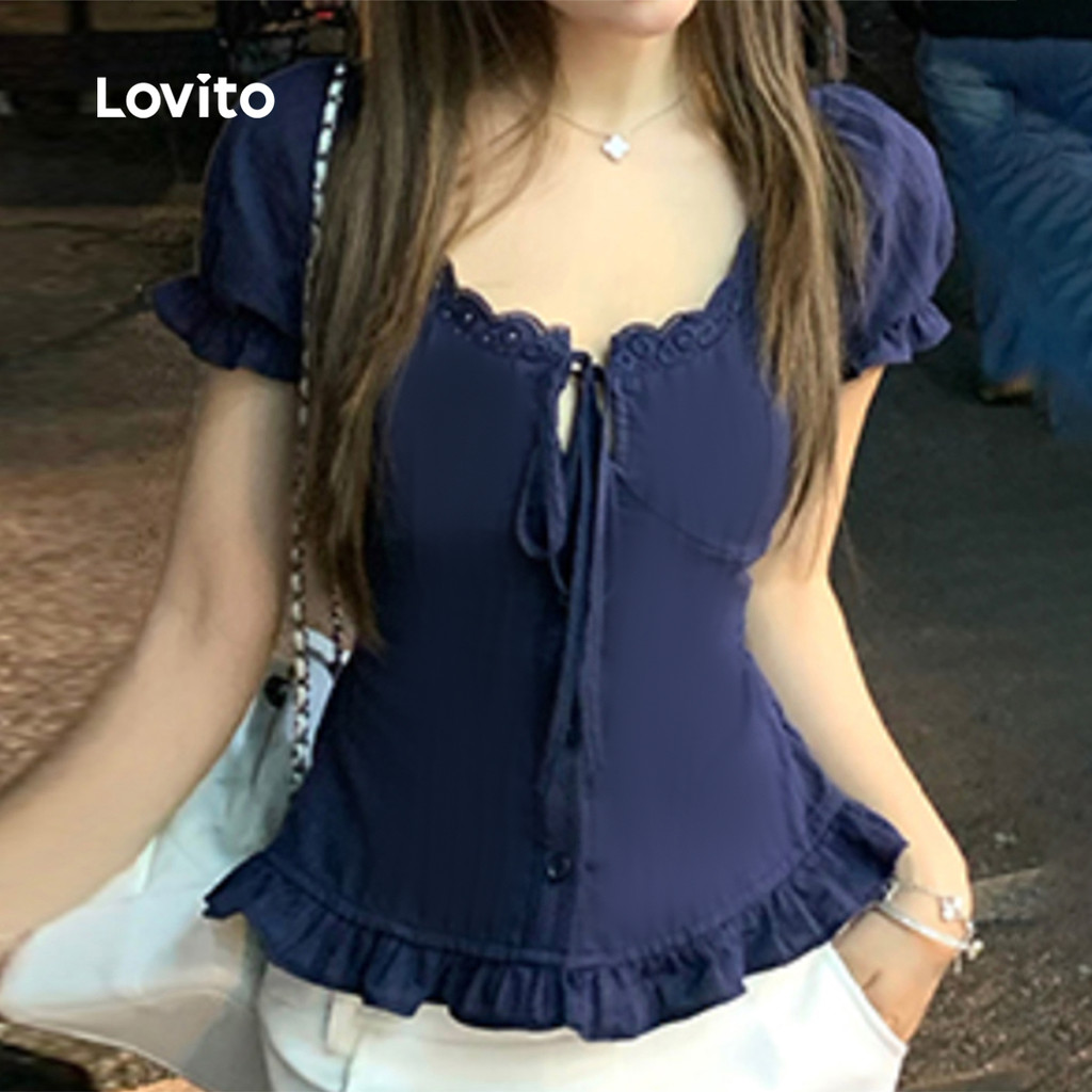 ✅DESTAQUES -❤️Frill -❤️Amarre -se -❤️Legal e confortável -❤️Primavera e verão ✅DESCRIÇÕES Estampa / Padrão:Plano Estilo:Casual Tamanho Plus:Não Material:Poliéster Composição:100% Poliéster Tipo de modelagem:justa ao corpo Transparência:Não Esticar:Não esticado Feito na China ✅O PACOTE INCLUI 1XBlusa ✅INTRODUÇÃO LOVITO A Lovito é uma marca em crescimento que acredita no poder das meninas. Estamos comprometidos em oferecer opções de roupas fashion e acessíveis, para todos os estilos, necessidades e identidades. Acreditamos que a moda deve ser divertida, liberadora e fazer você se sentir incrível. Afinal, o melhor acessório para qualquer look é a autoconfiança! ✅NOTAS DE COMPRA Antes de comprar, dê uma olhadinha na tabela de medidas disponível no site. Lembre-se de que, por serem feitas manualmente, as medidas podem variar de 1 a 2 cm. As cores dos produtos também podem ter pequenas diferenças em relação às fotos, dependendo da iluminação e das configurações do seu dispositivo. Siga nossa loja e conheça novos itens e as melhores ofertas para você!! Se você tiver alguma dúvida, converse conosco e responderemos o mais rápido possível.😊