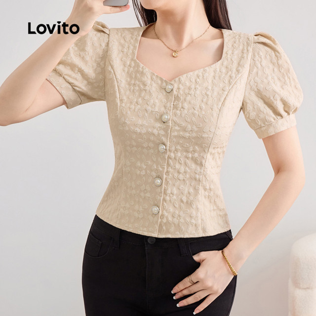 (New) Lovito Blusa Casual de Botões com Linha de Textura para Primavera/verão Blusa de Damasco para mulheres L243AD1777