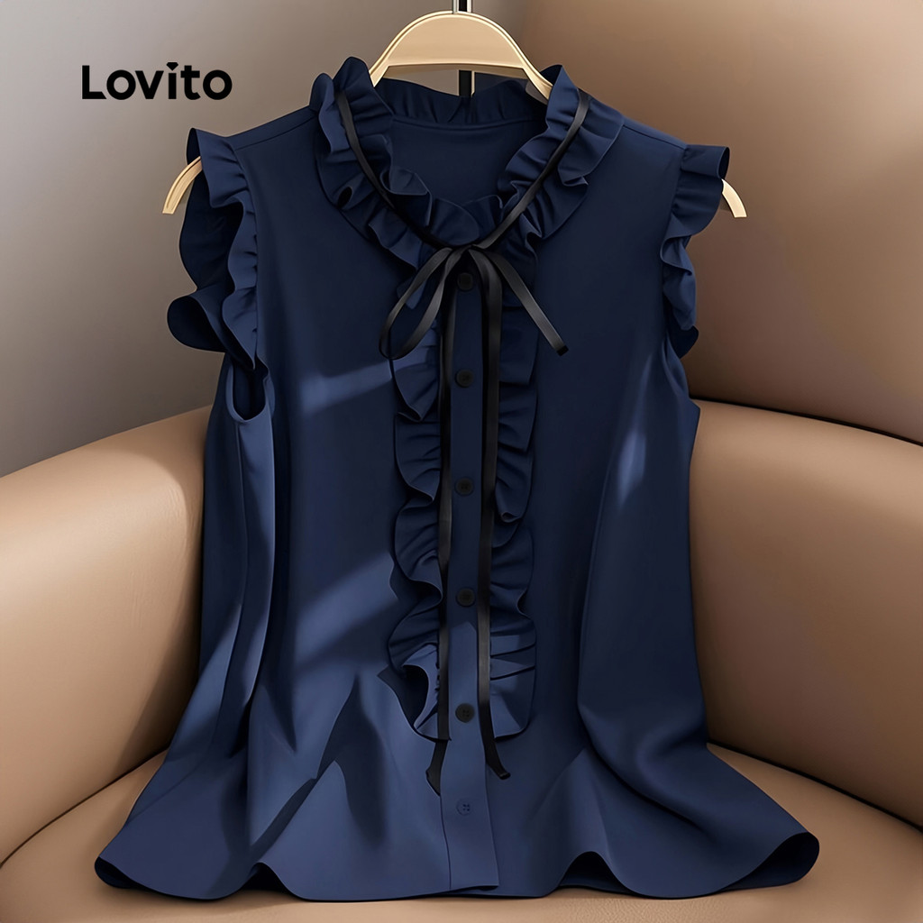 (NEW) Lovito Blusa Elegante com Babado e Laço Primavera/verão Blusa Azul-marinho para Mulheres LBL29047