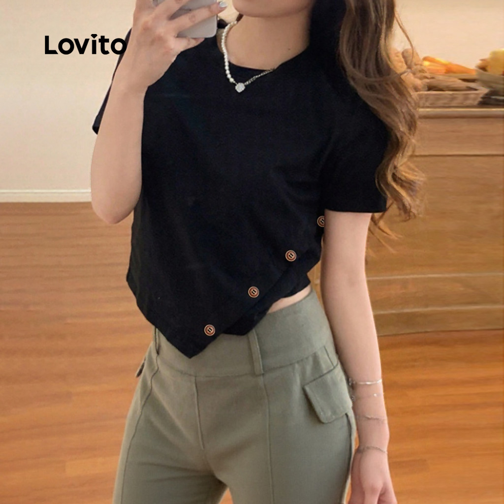 ✅DESTAQUES -❤️Assimétrico -❤️Botão -❤️Linha de estrutura -❤️Macio e confortável -❤️Primavera e verão ✅DESCRIÇÕES Estampa / Padrão:Liso Estilo:Casual Tamanho Plus:Não Composição:95% Poliéster + 5% Elastano Tipo de modelagem:Justo ao corpo Transparência:Não Esticar:Leve estiramento Feito na China ✅O PACOTE INCLUI 1XCamiseta ✅INTRODUÇÃO LOVITO A Lovito é uma marca em crescimento que acredita no poder das meninas. Estamos comprometidos em oferecer opções de roupas fashion e acessíveis, para todos os estilos, necessidades e identidades. Acreditamos que a moda deve ser divertida, liberadora e fazer você se sentir incrível. Afinal, o melhor acessório para qualquer look é a autoconfiança! ✅NOTAS DE COMPRA Antes de comprar, dê uma olhadinha na tabela de medidas disponível no site. Lembre-se de que, por serem feitas manualmente, as medidas podem variar de 1 a 2 cm. As cores dos produtos também podem ter pequenas diferenças em relação às fotos, dependendo da iluminação e das configurações do seu dispositivo. Siga nossa loja e conheça novos itens e as melhores ofertas para você!! Se você tiver alguma dúvida, converse conosco e responderemos o mais rápido possível.😊