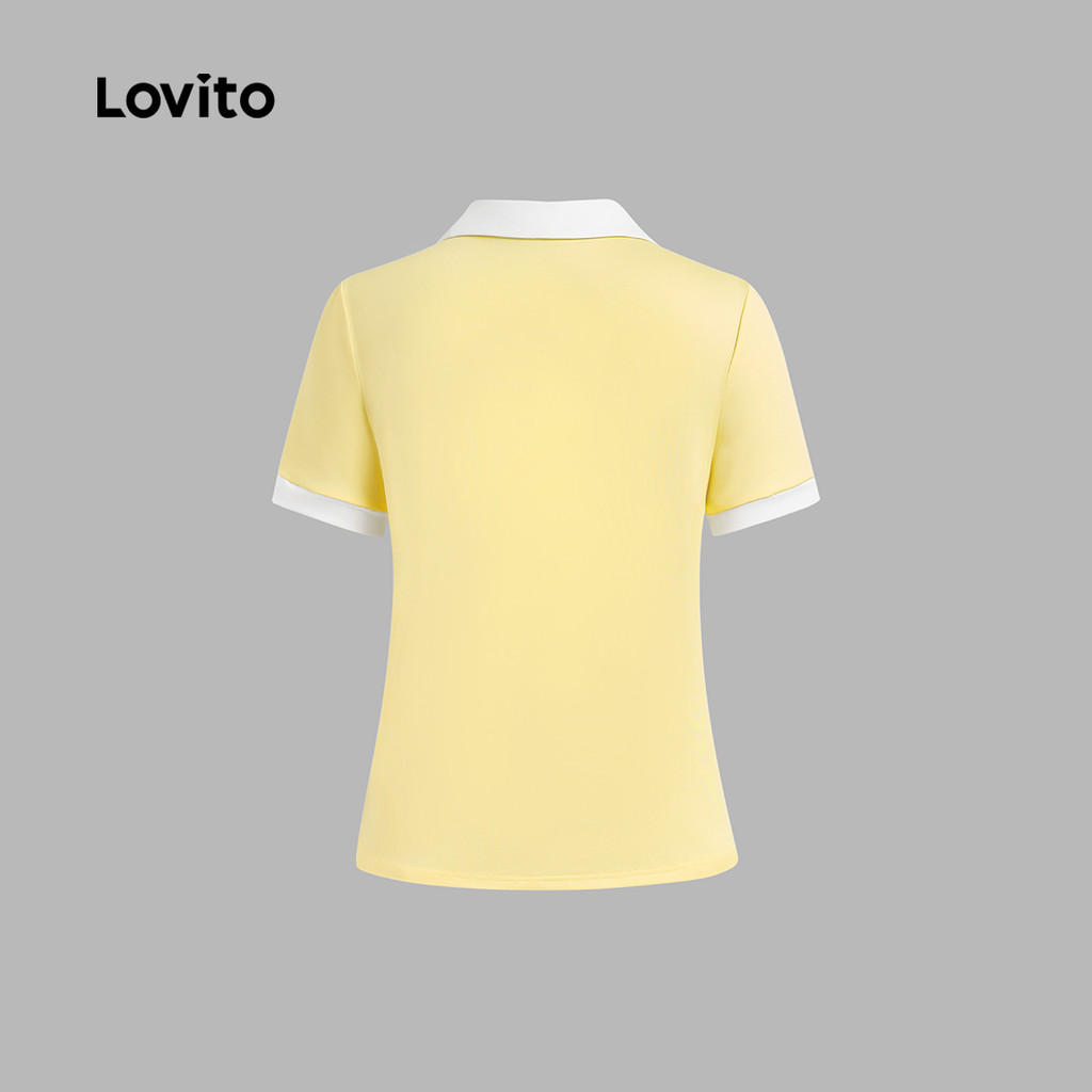 (New) Lovito Camisa Casual de Manga Curta com Blocos de Cor Primavera/verão Camiseta Amarela para mulheres L142ED139