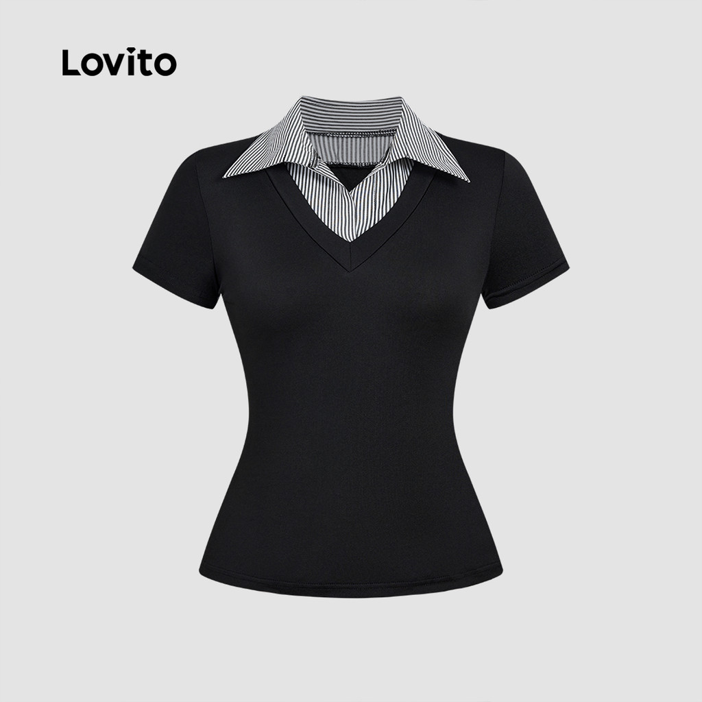 (NEW) Lovito Camisa Polo Preppy com Gola de Contraste Costura de Tecido Camiseta de Primavera/Verão L155ED843