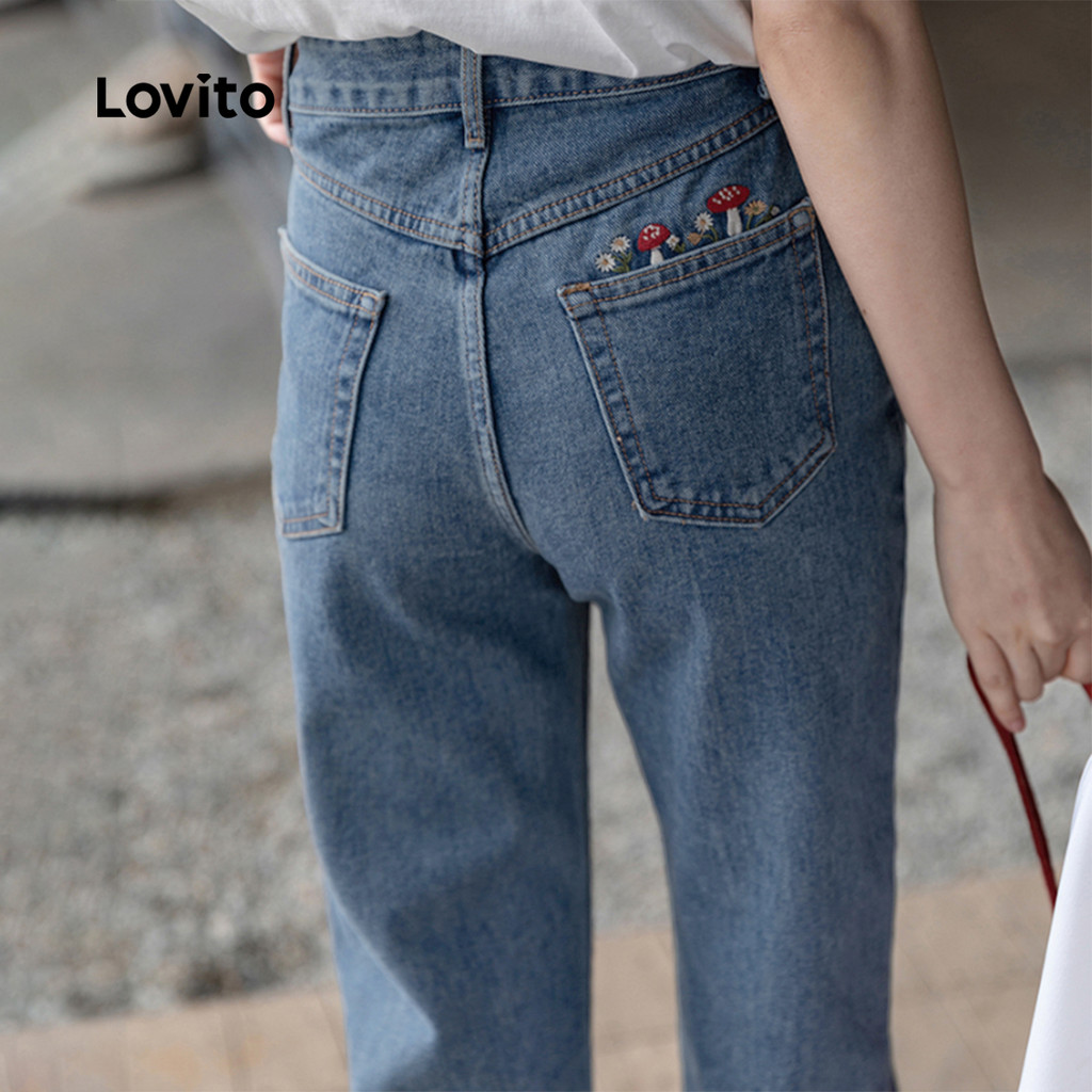 (New) Lovito Jeans Casuais Bordados Primavera/verão Jeans Azuis para Mulheres L151AD121