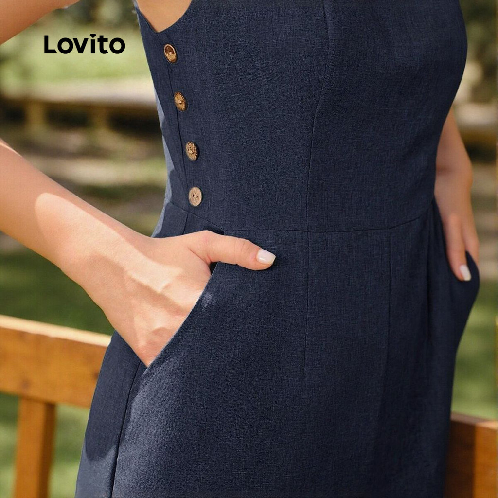 (NEW) Lovito Macacão Casual de Botões com Linha de Estrutura para Primavera/verão Macacão azul-marinho L155AD1555
