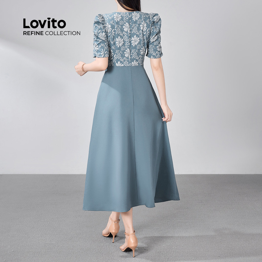 (New) (Lovito Refine) Tecido de Vestido Elegante com Costura Jacquard Primavera/verão Azul para mulheres LR18ED006