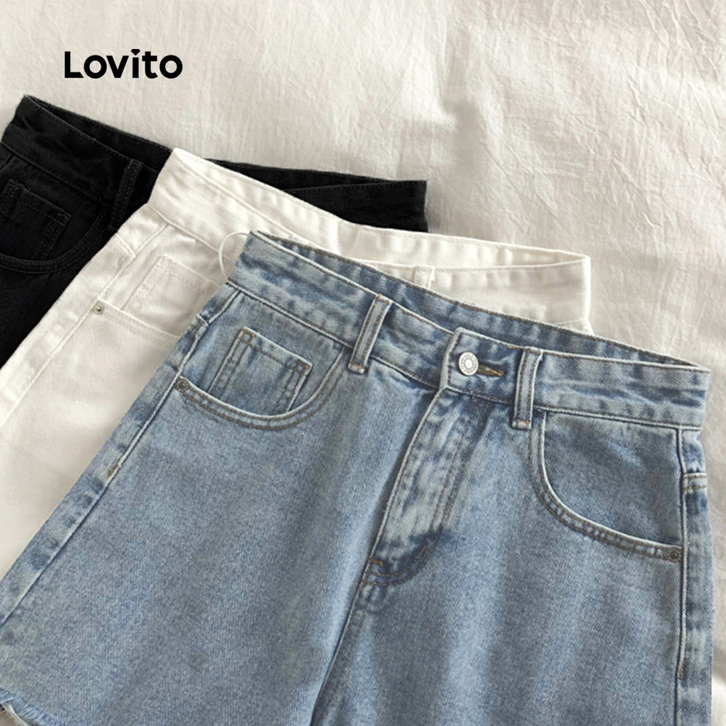 (NEW) Lovito Shorts de Jeans Casuais com Franjas Bolsos Zíper Primavera/verão Azul para mulheres LNL117218