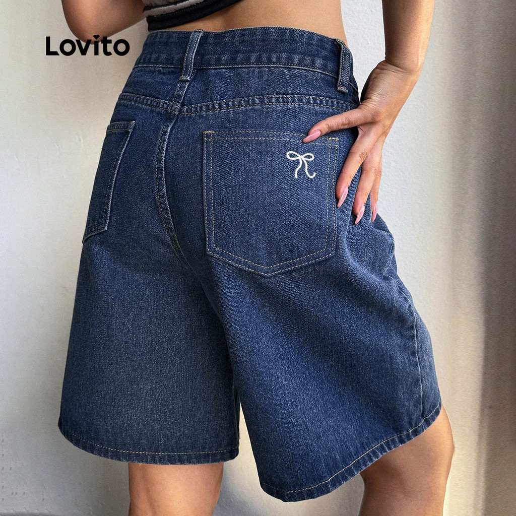 (New) Lovito Shorts Jeans Casuais com Zíper Primavera/verão Shorts Jeans Azul Escuro para Mulheres L149LD399