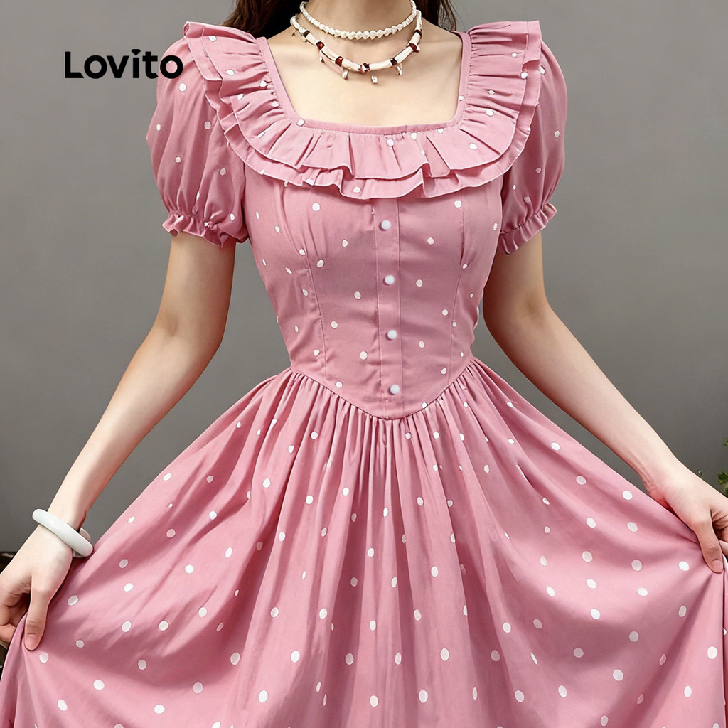 (NEW) Lovito Vestido Casual Babados Bolinhas Primavera/verão Rosa para Mulheres L172ED704