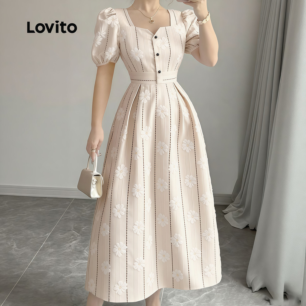 (NEW) Lovito Vestido Casual com Botões Na Frente e Recortes Vestido Primavera/verão para Mulheres L177ED409