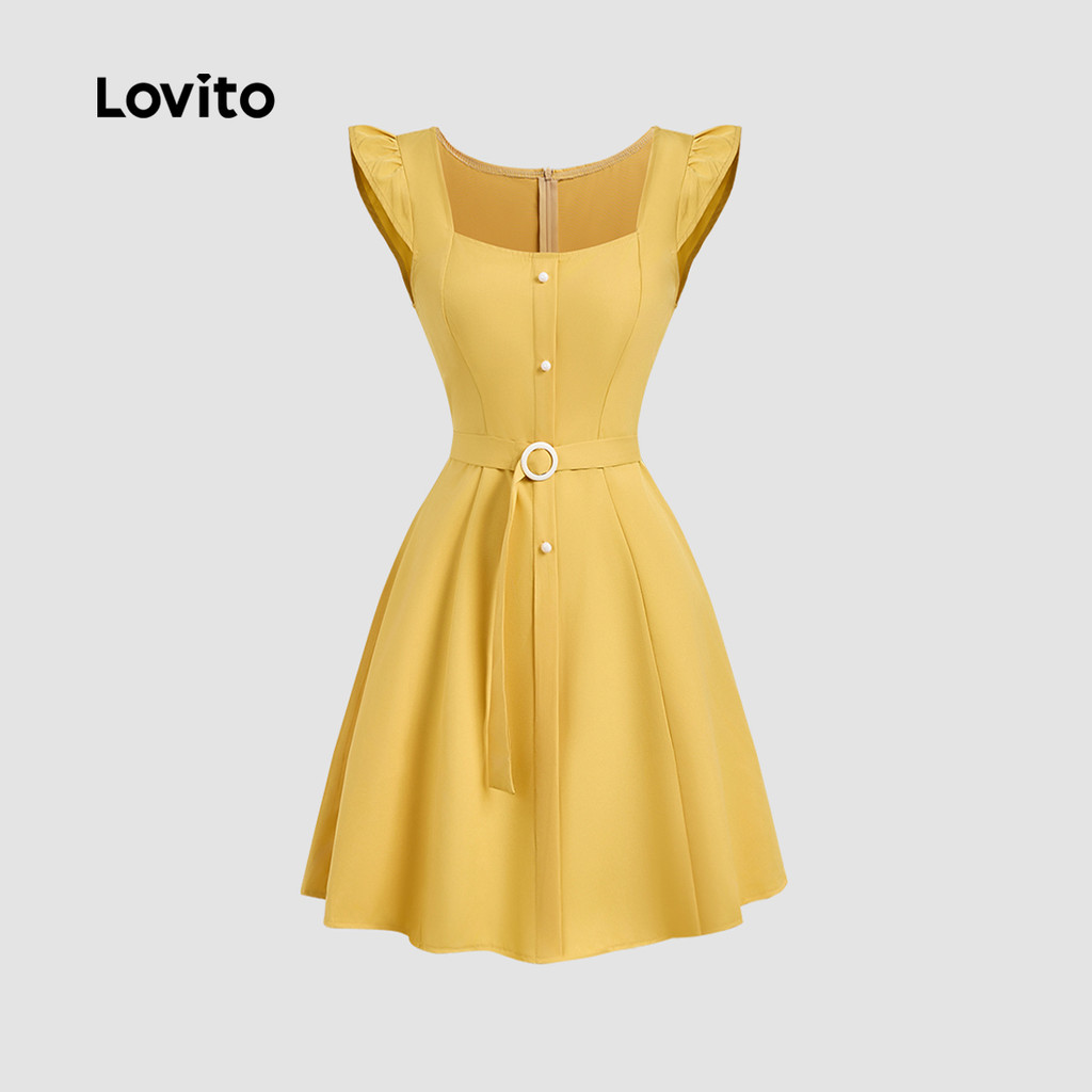 (New) Lovito Vestido Casual com Cinto para Primavera/verão em Amarelo para Mulheres L142ED864