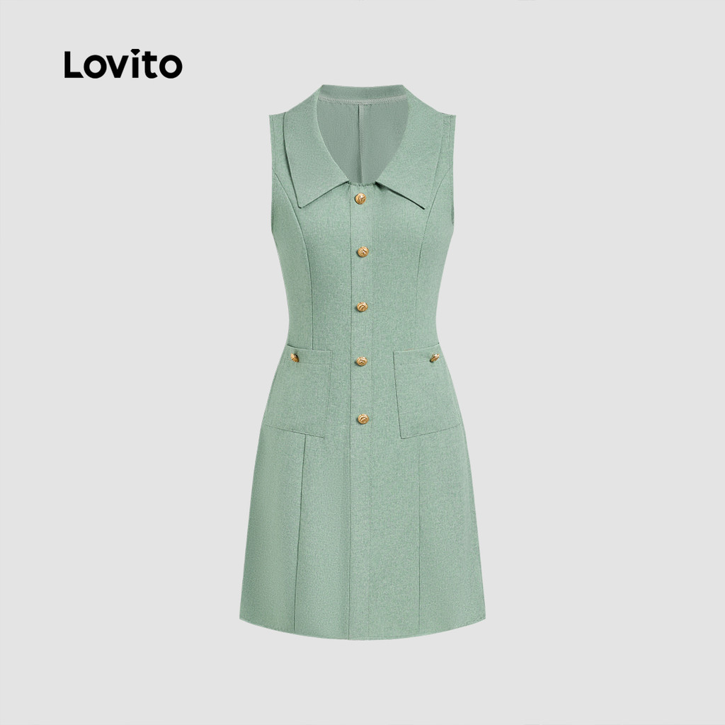 (New) Lovito Vestido Casual de Botão com Pregas para Primavera/verão Verde para mulheres L142ED664