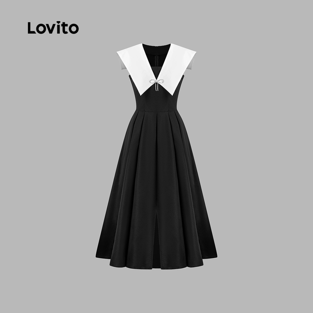 (New) Lovito Vestido Elegant Colorblock Primavera/verão Preto e Branco para Mulheres L150ED064