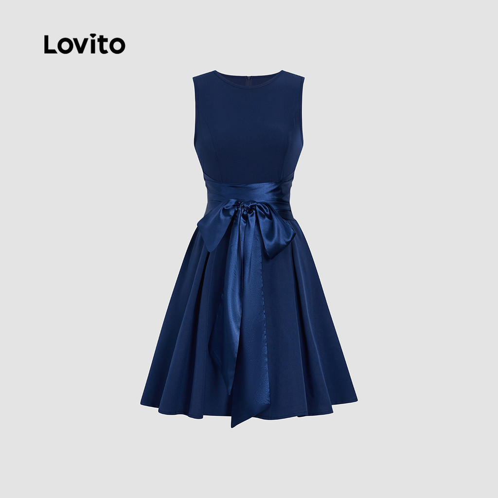 (NEW) Lovito Vestido Elegante com Fita de Contraste Costura em Tecido Primavera/verão Vestido Azul escuro L155AD289