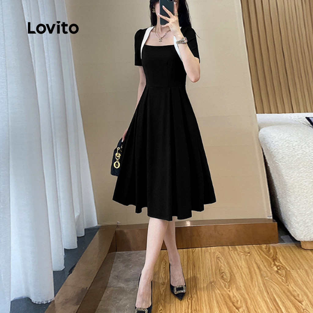 (New) Lovito Vestido Elegante de Cores em Bloco Simples para Primavera/verão Preto para Mulheres L143ED157