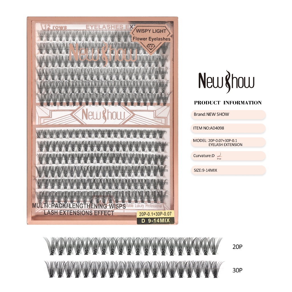 New Show 1 Cartela De AD4098-20P-0.1+30P-0.07 D 9-14MIX Cilios Tufos+1 Pinça+1 Super Cola 30ml Salon Pro