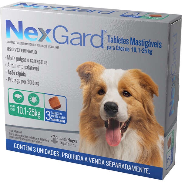 - Segurança e eficácia na medida; - Proteção mensal contra pulgas e carrapatos; - Pode ser administrado com ou sem alimentos; - Disponível em embalagens com um ou três tabletes; - Tablete mastigável sabor carne que os cães adoram; - Indicado para todos os cães a partir de 8 semanas de idade. Referência no tratamento contra pulgas e carrapatos, o Antipulgas e Carrapatos NexGard 68 mg para Cães de 10,1 a 25 Kg é comprovadamente seguro para cães de qualquer raça e conta com uma linha completa para atender diferentes portes e pesos. Pode ser administrado em cães adultos e filhotes a partir de oito semanas de vida e pesando acima de 2kg. Nexgard tem um rápido início de ação e atinge 100% de eficácia em 8 horas para pulgas. O NexGard funciona por 30 dias. Para manter seu pet livre de pulgas e carrapatos, faça o tratamento mensal. NexGard: a solução na medida contra pulgas e carrapatos. Modo de Uso: A administração de NexGard será uma tarefa fácil, pois o tablete mastigável sabor carne é altamente aceito pelos cães, graças a sua alta palatabilidade. Pode ser oferecido com ou sem alimentos, pois não altera sua eficácia. Para melhores resultados, garanta que o seu cão consuma o tablete por inteiro e observe por alguns minutos para se certificar de que nenhuma parte foi desperdiçada. Escolha número 1 entre os veterinários, no combate de pulgas e carrapatos pode ser administrada no seu cachorro com um tablete delicioso. NexGard é aprovado pelo FDA (Food and Drug Administration) o órgão governamental dos Estados Unidos responsável pelo controle dos alimentos e também pelo MAPA ( Ministério da Agricultura, Pecuária e Abastecimento), fazendo dele comprovadamente seguro para uso em cachorros e demonstrou 100% de eficácia. Para melhores resultados, garanta que o seu cachorro consuma o tablete por inteiro e o observe por alguns minutos para garantir que nenhuma parte seja desperdiçada. Caso o tablete não tenha sido consumido por inteiro ou se houver vômito dentro de 2 horas, de outro tablete para garantir sua eficácia. Perguntas frequentes: 1) Por que vejo uma maior quantidade de pulgas em meu cachorro após o uso de NexGard? A ação de NexGard na pulga causa hiperestimulação, desta forma elas sobem para as extremidades dos pelos enquanto morrem. 2) O banho atrapalha a eficiência de NexGard? Banhos ou qualquer atividade do cachorro na água não interfere na ação de NexGard. 3) Meu cachorro pode utilizar NexGard caso esteja utilizando outros medicamentos? Sim. Os medicamentos não impactaram a segurança ou a eficácia de NexGard. 4) Posso administrar NexGard com intervalo menor que 30 dias? Não é recomendada. 5) Quais são os efeitos adversos que podem decorrer do uso de NexGard? Vômito, pele seca ou descamativa, diarreia, letargia e falta de apetite. Deve-se utilizar com cautela em cachorros com histórico de convulsões.