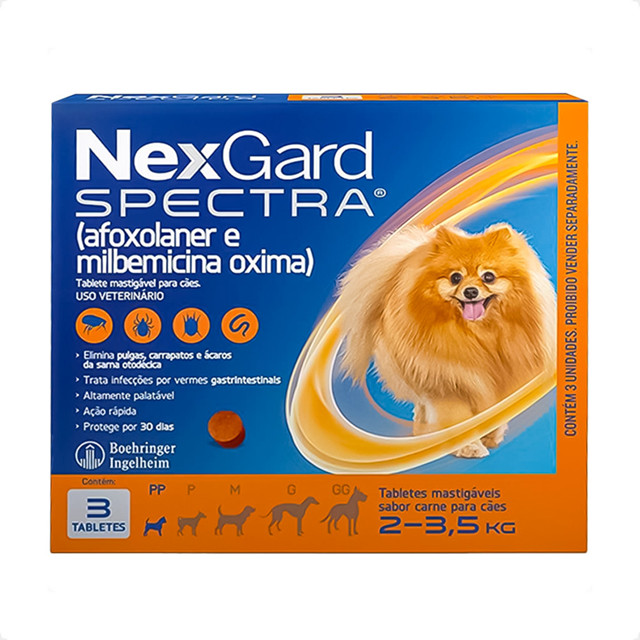 NexGard Spectra para Cães 2 a 3,5kg - 3 Tabletes - Segurança e eficácia na medida; - Ação interna e externa em uma única dose; - Disponível em embalagem com um tablete; - Proteção mensal contra pulgas, carrapatos, sarna e vermes; - Pode ser administrado com ou sem alimentos; - Tablete mastigável sabor carne que os cães adoram; - Indicado para todos os cães a partir de 8 semanas de idade. * Consulte sempre o Médico Veterinário de sua confiança para o uso apropriado deste produto. Leia a bula ou informações descritas na embalagem. Detalhes Referência no tratamento contra pulgas, carrapatos, sarna e vermes, o Antipulgas e Carrapatos NexGard Spectra para Cães de 2 a 3,5 Kg é comprovadamente seguro para cães de qualquer raça e conta com uma linha completa para atender diferentes portes e pesos. Pode ser administrado em cães adultos e filhotes a partir de oito semanas de vida e pesando acima de 2kg. Nexgard Spectra tem um rápido início de ação e atinge 100% de eficácia em 8 horas para pulgas. O NexGard spectra funciona por 30 dias. Para manter seu pet livre de pulga, carrapato, sarna e vermes, faça o tratamento mensal. Modo de Uso: A administração de NexGard será uma tarefa fácil, pois o tablete mastigável sabor carne é altamente aceito pelos cães, graças a sua alta palatabilidade. Pode ser oferecido com ou sem alimentos, pois não altera sua eficácia. Para melhores resultados, garanta que o seu cão consuma o tablete por inteiro e observe por alguns minutos para se certificar de que nenhuma parte foi desperdiçada. Recomendações: Em casos de reações adversas ao tratamento, suspenda o uso e consulte o médico-veterinário imediatamente. Siga sempre a dosagem recomendada e leia a bula. Aconselha-se realizar limpeza completa do ambiente para auxiliar no controle de parasitas. Dicas Especiais Escolha número 1 entre os veterinários, no combate de pulgas e carrapatos pode ser administrada no seu cachorro com um tablete delicioso. NexGard é aprovado pelo FDA (Food and Drug Administration) o órgão governamental dos Estados Unidos responsável pelo controle dos alimentos e também pelo MAPA ( Ministério da Agricultura, Pecuária e Abastecimento), fazendo dele comprovadamente seguro para uso em cachorros e demonstrou 100% de eficácia. Para melhores resultados, garanta que o seu cachorro consuma o tablete por inteiro e o observe por alguns minutos para garantir que nenhuma parte seja desperdiçada. Caso o tablete não tenha sido consumido por inteiro ou se houver vômito dentro de 2 horas, de outro tablete para garantir sua eficácia. Perguntas frequentes: 1) Por que vejo uma maior quantidade de pulgas em meu cachorro após o uso de NexGard? A ação de NexGard na pulga causa hiperestimulação, desta forma elas sobem para as extremidades dos pelos enquanto morrem. 2) O banho atrapalha a eficiência de NexGard? Banhos ou qualquer atividade do cachorro na água não interfere na ação de NexGard. 3) Meu cachorro pode utilizar NexGard caso esteja utilizando outros medicamentos? Sim. Os medicamentos não impactaram a segurança ou a eficácia de NexGard. 4) Posso administrar NexGard com intervalo menor que 30 dias? Não é recomendada. 5) Quais são os efeitos adversos que podem decorrer do uso de NexGard? Vômito, pele seca ou descamativa, diarreia, letargia e falta de apetite. Deve-se utilizar com cautela em cachorros com histórico de convulsões. Indicação: Cachorros Porte/Raça: Raças Minis, Raças Pequenas Idade: Filhotes, Adultos, Idosos Composição: Afoxolaner e Milbemicina Oxima Apresentação: 3 Tabletes