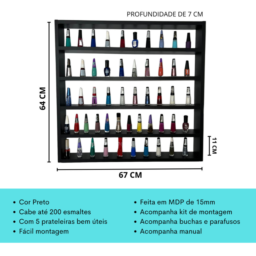 NICHO EXPOSITOR PARA ESMALTES MEDIDAS DO EXPOSITOR: - Altura: 64 cm - Largura: 7 cm - Comprimento: 67 cm DESCRIÇÃO DO EXPOSITOR: - Acompanha suporte de fixação, parafusos e buchas. - Com 5 prateleiras para 200 esmaltes. - Fabricado em MDP/MDF de 15 mm. - Suporta até 30 Kg. - Preto Deixe o seu salão mais bonito e sofisticado com o nosso Expositor de Esmaltes. Também pode ser usado em diversos ambientes tais como salão, estética, ateliê de costura, ateliê de pintura e até mesmo brinquedos em miniaturas no quarto das crianças. *Os esmaltes não acompanham o produto. Dúvidas Frequentes: 1. Os produtos são enviados desmontados? R. Sim, para evitar danos no transporte nós enviamos os nossos produtos desmontados. 2. A montagem é fácil? R. Muito fácil, os nossos produtos podem ser montados apenas com uma simples chave philips, além disso, acompanha manual de montagem, todos os furos já feitos, parafusos e acessórios. 3. O produto está disponível à pronta entrega? R. Todos os nossos produtos são para pronta entrega. 4. O produto acompanha nota fiscal? R. Emitimos nota fiscal para todos os clientes que compram os nossos produtos. 5. Como são realizadas as entregas? R. As entregas são feitas exclusivamente através do Shopee Xpress que pertence a Shopee. Toda a Responsabilidade da entrega e calculo no valor de frete pertence a Shopee. 6. Quando o pedido é despachado? R. Pedidos com pagamento confirmado são despachados no prazo estipulado pela Shopee, habitualmente nós despachamos em no máximo 24hs. Ainda tem alguma dúvida? Utilize o campo de perguntas a baixo que responderemos o mais rápido possível. Política de devolução: A política de devolução da nossa empresa é bastante flexível, aceitamos devoluções por qualquer motivo em até 07 (sete) dias corridos após o recebimento do seu pedido. A devolução também é válida caso seja o produto esteja em desacordo com o pedido ou nota fiscal. Garantia: 90 dias contra possíveis defeitos de fabricação.