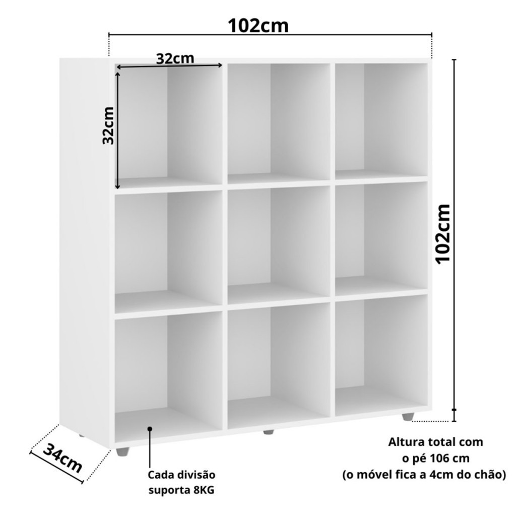Dimensões: - Altura: 102,00 cm - Largura: 102,00 cm - Profundidade: 34,00 cm - Peso: 29,200 kg Descrição: O(a) Nicho Organizador Branco - Movelbras é produzido em MDP na escala de brilho Fosco, e possui um grau de dificuldade de montagem: Médio. Seu revestimento/acabamento é: Chapa em BP. Infelizmente a Loja não oferece serviço de montagem, deixamos essa informação bem clara em todas as nossas páginas de produto. Onde especificamos que os móveis chegarão desmontados, e que a montagem fica por conta do cliente. Como não oferecemos esse serviço não embutimos o mesmo no preço dos produtos, ou seja, maior economia para você! Todos os nossos móveis também acompanham o manual de montagem, e caso você queira, pode realizar a montagem você mesmo, sempre especificamos os graus de montagem dos produtos. Nos casos de grau baixo e médio, com pouco ou nenhum conhecimento, você mesmo pode efetuar a montagem, e fazer essa economia. Apenas nos graus de montagem alto, recomendamos a contratação de um montador com experiência, visto que são montagens mais complicadas. A montagem é feita com Parafusos, cavilhas e Minifix.. Este móvel é indicado para que seja utilizado no(a) Quarto, Sala de Estar, Cozinha, Lavanderia, Escritório, Quarto Bebê, Quarto Infantil e Decoração de Ambientes, dando um toque especial no cômodo de sua casa. Para que você mantenha seu produto sempre em ótimo estado, recomendamos que use apenas um pano seco ou levemente umedecido, sem o uso de quaisquer produtos abrasivos. A Loja garante aos clientes, 90 dias de garantia nos produtos, porém, recomendamos que entre em contato com o fornecedor/marca do produto, pois o mesmo(a), pode garantir um prazo maior de garantia. Lembrando ainda que: quaisquer objetos decorativos que aparecem nas imagens, não acompanham o produto. Características: - Espessura da Estrutura: 15mm - Possui Gavetas?: Não - Possui Portas?: Não - Possui Vidro?: Não - Possui Espelho?: Não - Possui Prateleiras?: Sim - Quantidade de Prateleiras: 9 - Peso Suportado nas Prateleiras:: 8 Kg - Possui Puxadores?: Não - Possui Ripamento?: Não - Linha ou Coleção: P25 - Montagem Invertida?: Pode ser Montado de Ambos os Lados - É frágil?: Não - Material do Nicho: MDP - Peso Suportado no Nicho (Kg): 2 Kg - Possui Nicho?: Sim - Quantidade de Nichos: 9 - Material da Estrutura: MDP - Escala de Brilho: Fosco - Possui Rodízios?: Não - Possui Pés?: Sim - Pés com regulagem de altura?: Não - Quantidade de Pés/Sapatas: 5 - Peso Suportado (Kg): 72 - Possui Espelho: Não - Material dos Pés: Plástico - Acompanha: kit de segurança com sistema antitombamento - Acompanha Manual de Montagem: Sim - Como os Móveis Chegarão na Minha Casa: Desmontado em caixas, acompanhado de todas as peças, ferragens e manuais para montagem. - Grau de Dificuldade da Montagem: Médio - Necessita de Montagem: Sim - Sistema de Montagem: Parafusos, cavilhas e Minifix. - Garantia (dias): 90 - Indicação de Uso: Quarto, Sala de Estar, Cozinha, Lavanderia, Escritório, Quarto Bebê, Quarto Infantil, Decoração de Ambientes - Observação: Objetos decorativos que aparecem nas imagens, não acompanham o produto. - Recomendação de Manutenção: Utilizar pano levemente umedecido, seguido de pano seco. Não utilizar quaisquer produtos abrasivos. - Revestimento /Acabamento: Chapa em BP