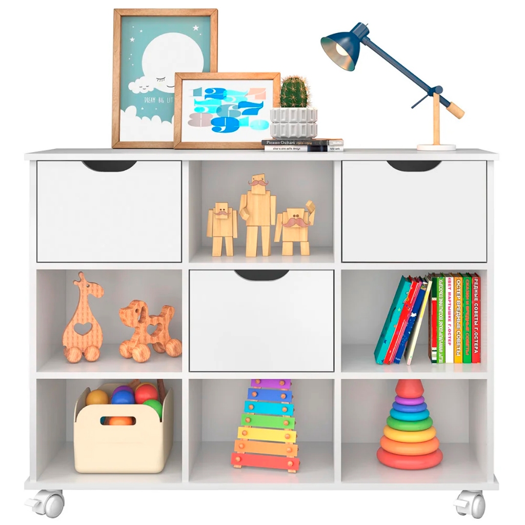 O Nicho Organizador com Rodízios Toys 3 Gavetas Q01 Branco, da Mpozenato é ideal para você organizar sua casa, e ainda decorar! Um móvel versátil e funcional que pode ser usado em diversos ambientes da casa. Ele possui 6 Nichos Abertos para livros, objetos decorativos, brinquedos ou o que mais você quiser. Além disso o Nicho Organizador, ele conta com 3 gavetas com detalhe curvado que dispensa puxadores e dá um design minimalista ao móvel. O Nicho com Gavetas é feito de MDP de alta qualidade e tem acabamento em pintura UV que garante maior durabilidade e resistência. Ah e ele ainda possui rodízios que facilitam a movimentação e a limpeza do espaço. Gostou? Então já adiciona em seu carrinho e garanta agora mesmo! ESPECIFICAÇÕES Dimensões do Produto Largura: 108 cm. Altura: 83 cm. Profundidade: 33,5 cm. Peso: 29,90 Kg. Características do Produto Material da Estrutura: MDP 15 mm. Material do Fundo: MDF 3 mm. Peso suportado: 22 Kg distribuídos. Tonalidade: Branco. Acabamento: Pintura UV Atóxica. Escala de Brilho: Brilhante. Possui Gavetas: Sim. Possui Rodízios: Sim. Diferenciais: - Produto multifuncional. - Gavetas com fitas de feltro para não riscar o produto. - Frente das gavetas com acabamento de bordas em pintura PU. Sistema de Montagem: Minifix / Cavilhas / Parafusos. Manual de Montagem: Sim. Complexidade da Montagem: Baixa. Volumes: 2 Volumes. Garantia do Fabricante: 3 meses contra defeito de fabricação. Montagem: Recomendamos que seja feita por um profissional. Recomendação de Limpeza: Pano levemente úmido e detergente neutro. Observações importantes - Produto para uso residencial em ambiente interno, não devendo ficar exposto diretamente ao sol, calor e umidades excessivas. - Pode haver alguma diferença de tonalidade entre a imagem e o produto real, por conta do tratamento de imagens e a calibração de cores do seu monitor. - As imagens são meramente ilustrativas, não acompanham objetos de decoração e eletrônicos. - Ao receber a mercadoria, o cliente deve verificar as condições da embalagem, caso haja alguma avaria não assine o comprovante de recebimento. - Montagem, desmontagem e outras instalações serão de responsabilidade do cliente. Não nos responsabilizamos, no ato da entrega, por subir escadas/elevadores ou pelo transporte por guincho em apartamentos. Eventuais despesas são de responsabilidade do comprador. - Confira as dimensões do produto e certifique-se de que passará normalmente por supostos elevadores, portas, escadas e/ou corredores de sua residência.