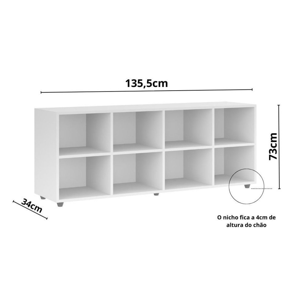 O nicho possui 8 compartimentos, para acomodar livros, brinquedos e uma diversidade de objetos da criança. Otimiza espaço e mantém os ambientes organizados. Acompanha o kit de segurança com sistema antitombamento, proporcionando maior segurança e evitando acidentes. Obs: imagens meramente ilustrativas, decoração não acompanha o móvel. Parafusos ficam a mostra, por segurança não foram utilizados tapa-furos. Não realizamos a montagem. Peso (kg): 25 Garantia: 03 Meses Altura (cm): 73 Largura (cm): 135.5 Possui Nichos: 8 Tipo de Nicho: Prateleira Suporta Até (kg): 48 Profundidade (cm): 34 Ambiente Principal: Quarto Infantil Material Principal: MDP Marca: MOVELBRAS Cor: Branco Quantidade de Prateleiras: 08 Prateleiras Quantidade de Gavetas: Não Possui