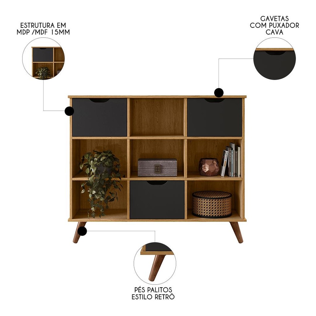 Conheça o Nicho Organizador Retrô 3 Gavetas Freijó/Preto da Qmovi que combina funcionalidade com um design elegante, ideal para quem busca organizar e ao mesmo tempo decorar qualquer ambiente da casa. Com 6 Nichos abertos, oferece espaço suficiente para livros, objetos de decoração e brinquedos para o ambiente infantil, o Nicho Organizador, conta com 3 gavetas e detalhes curvos proporcionam um toque de minimalismo e sofisticação. A qualidade do Nicho Retrô em MDP e o acabamento em pintura UV asseguram a durabilidade do móvel. Os pés retrô não só adicionam um charme, como também protegem o móvel do contato direto com o chão, garantindo sua conservação. Este nicho é uma escolha inteligente para quem valoriza estética e praticidade no lar. Adicione ao carrinho e garanta o seu agora mesmo. ESPECIFICAÇÕES Dimensões do Produto Largura: 108 cm. Altura: 83 cm. Profundidade: 33 cm. Peso: 28Kg. Características do Produto Material da Estrutura: MDP/MDF. Espessuras das Chapas: 12mm/15mm. Peso suportado: 34 kg distribuídos. Acabamento: Pintura UV. Escala de Brilho: Brilho/Fosco. Possui Portas: Não. Possui Gavetas: Sim. Quantidade de Gavetas: 3 Gavetas. Possui Prateleiras: Não. Possui Nicho: Sim. Quantidade de Nichos: 9 Nichos. Possui Pés: Sim. Tipo dos Pés: Palito Retrô. Diferenciais: - Gavetas com cavas para facilitar abertura. - Excelente acabamento. - Design moderno. - Pés palitos retrô. - Ótima capacidade de armazenamento. Sistema de Montagem: Minifix / Cavilhas / Parafusos. Manual de Montagem: Sim. Complexidade da Montagem: Média. Volumes: 3 Volumes. Conteúdo da embalagem: 1 Nicho e 3 Gavetas. Garantia do Fabricante: 90 dias contra defeito de fabricação. Montagem: Recomendamos que seja feita por um profissional. Recomendação de Limpeza: Pano levemente úmido e detergente neutro. Observações importantes - Produto para uso residencial em ambiente interno, não devendo ficar exposto diretamente ao sol, calor e umidades excessivas. - Pode haver alguma diferença de tonalidade entre a imagem e o produto real, por conta do tratamento de imagens e a calibração de cores do seu monitor. - As imagens são meramente ilustrativas, não acompanham objetos de decoração e eletrônicos. - Ao receber a mercadoria, o cliente deve verificar as condições da embalagem, caso haja alguma avaria não assine o comprovante de recebimento. - Montagem, desmontagem e outras instalações serão de responsabilidade do cliente. Não nos responsabilizamos, no ato da entrega, por subir escadas/elevadores ou pelo transporte por guincho em apartamentos. Eventuais despesas são de responsabilidade do comprador. - Confira as dimensões do produto e certifique-se de que passará normalmente por supostos elevadores, portas, escadas e/ou corredores de sua residência.