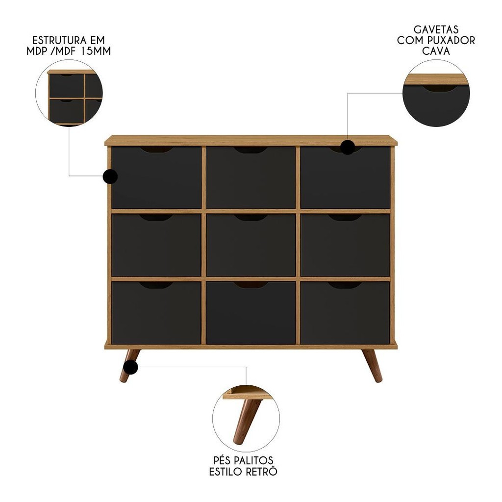 Nicho Organizador Retrô 9 Gavetas Freijó/Preto - Qmovi