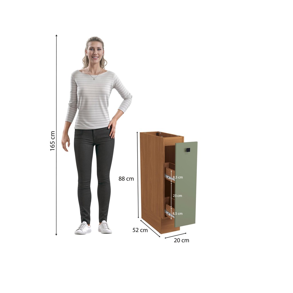 Transforme sua cozinha e a deixe mais completa com a beleza e praticidade do Nicho Porta Condimentos 20cm R660 da Cozinha Pixel da Kappesberg. Produzido em chapa MDP de 15mm, garante robustez, firmeza e qualidade, além de um acabamento lindo. Com até sete camadas de pintura, a caixaria possui acabamento touch na cor canela, com a textura dos veios da madeira, enquanto a porta, em MDP e acabamento BP, é mais resistente contra riscos, arranhões e gotas d'água, e na cor verde frevo, possui acabamento fosco. Uma combinação aconchegante e moderna, que dará ainda mais destaque ao seu espaço, remetendo aos tons da natureza e deixando sua cozinha perfeita. Fechando ótimas combinações com o aéreo do mesmo tamanho, o nicho pode ser montado com tampo ou pedra, e para um melhor acabamento, ele conta com rodapé, mas acompanha as ferragens para ser montado suspenso, e se você preferir, também pode adquirir os pés separadamente, garantindo muita praticidade. Com medidas de 88cm de altura, 20cm de largura e 52cm de profundidade, o nicho conta com uma porta corrediça e duas prateleiras, ideais para a organização de temperos e outros condimentos, facilitando o acesso e o preparo de suas receitas. O diferencial fica para as corrediças telescópicas, que permitem a abertura total e um melhor aproveitamento de espaço, além de maior resistência a peso. Já o puxador, metálico na cor preta, conta com detalhes em alto-relevo que completam o estilo e a qualidade do produto, garantindo um diferencial único para sua cozinha. Renove seu espaço e o deixe ainda mais completo com a Cozinha Pixel da Kappesberg. Medidas: • 88 cm de altura • 20 cm de largura • 52 cm de profundidade Itens inclusos: • Uma (1) gaveta (corrediças telescópicas) • Dois (2) porta condimentos • Produzido em MDP • Rodapés Código do produto: R660-CNVF Informações importantes: • As imagens são ilustrativas. • A Kappesberg não disponibiliza serviço de montagem (recomendamos a contratação de um profissional qualificado). • O manual de montagem acompanha o produto. • 3 meses de garantia para defeitos de fabricação.
