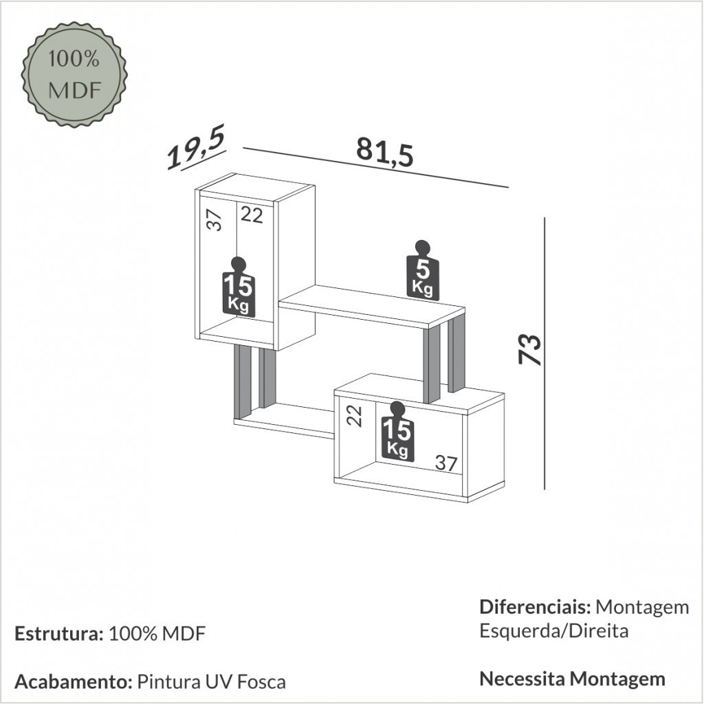 Descrição: Com design industrial moderno, o Nicho F25 é um item essencial para complementar a decor da sua casa com muita funcionalidade. Esse produto 100% MDF possui design industrial com 3 espaços para armazenamento e ripas, fixadas com ferragens de alta resistência. Com pintura de 6 camadas de proteção, a alta qualidade do acabamento faz com que esse produto se destaque em qualquer espaço. Esse produto já acompanha os suportes necessários para a fixação na parede. Características: - Tipo de prateleira: Cubo - Possui Pés?: Não - Possui Rodízios ?: Não - Garantia (dias): 180 - Sistema de Montagem: Parafusos, cavilhas e Minifix. - Necessita de Montagem: Sim - Grau de Dificuldade da Montagem: Médio - Como os Móveis Chegarão na Minha Casa: Desmontado em caixas, acompanhado de todas as peças, ferragens e manuais para montagem. - Indicação de Uso: Sala de Estar - Observação: Objetos decorativos que aparecem nas imagens, não acompanham o produto. - Recomendação de Manutenção: Para conservar a cor e os aspectos originais do produto, leve em consideração: Levantar a peça ao deslocá-la, o que ajuda a evitar danos à base e aos pés; Não utilizar água em abundância na peça, somente um pano levemente umedecido para a limpeza ou um espanador seco; Utilizar panos preferencialmente brancos, para evitar manchas e seque bem o móvel após a limpeza; Utilize somente água, nunca produtos químicos, abrasivos, solventes, ceras, sabonetes não neutros ou produtos de limpeza doméstica, visto que podem danificar o acabamento; Não coloque objetos quentes diretamente em cima do móvel para não causar bolhas, manchas ou outros danos, opte por utilizar um apoio; Se possível, não exponha sua peça diretamente ao sol, utilize cortinas ou persianas para bloquear os raios de luz, para que a pintura não desbote. Esses cuidados são muito simples e auxiliarão seu produto a permanecer em perfeito estado por muitos anos. - Revestimento /Acabamento: Pintura UV - Espessura da Estrutura: 6 mm e 15 mm - Possui Gavetas?: Não - Possui Portas?: Não - Possui Espelho?: Não - Possui Prateleiras?: Sim - Quantidade de Prateleiras: 2 - Peso Suportado nas Prateleiras: 5 Kg - Possui Puxadores?: Não - Linha: Industrial - Pode Ser Montado Invertido?: Não - Material da Estrutura: MDF - Escala de brilho: Fosco - Tipo: Lojista e E-commerce
