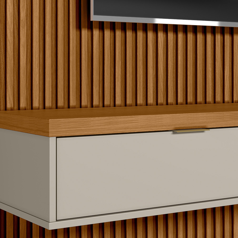 O Nicho suspenso 2.2 foi projetado para ser utilizado no painel ripado modular. Possui duas portas basculante com pistão à gás e um puxador de alumínio. Características: Espaço de TV no tampo: 2,18m de largura Tamanho de TV recomendado no tampo : 65 polegadas Nicho : 1 nicho que suporta até 40kg Passa fio: 1 Tampo : MDP com espessura de 37mm Porta : 2 portas basculantes em MDP Puxador : 2 puxadores de alumínio Dobradiças : 4 dobradiças metálica Demais acessórios : 2 pistão a gás Obs: Esse produto foi projetado para ser fixado no painel modular. Para a fixação na parede, deverá ser adquirido o kit instalação por terceiros. Dimensões: Altura: 0,23m Largura: 2,18 m Profundidade: 0,33 m Peso Bruto: 32,20 kg Quantidade de volumes: 1 Dúvidas Frequentes: 1) Sobre a montagem do produto, o mesmo vem montado? O produto vai desmontado e quanto a montagem do mesmo, a Linea Brasil não possui tais serviço. Todos os produtos acompanham manual de montagem. Alguns produtos possuem vídeo de montagem no canal oficial da Linea Brasil no YouTube. 2) Quais são os itens inclusos do produto? As decorações são meramente ilustrativas e não acompanham o produto. 3) Esse produto é de fácil montagem? O produto possui complexidade baixa no quesito montagem. Conte com a ajuda de um profissional, para melhor satisfação. 4) Qual o prazo de entrega? O prazo de entrega é estipulado de acordo com os prazos da transportadora parceira e CEP de destino. Você pode consultar o valor e prazo de entrega no próprio anúncio do produto. 5) O produto é enviado para todo o Brasil? Sim, entregamos em todo o Brasil, através de transportadoras parceiras. 6) Possui nota fiscal? Sim, todos os produtos da Linea Brasil são entregues com nota fiscal. 7) Qual a garantia do produto? Os produtos da Linea Brasil são garantidos por 90 dias contra defeitos de fabricação.