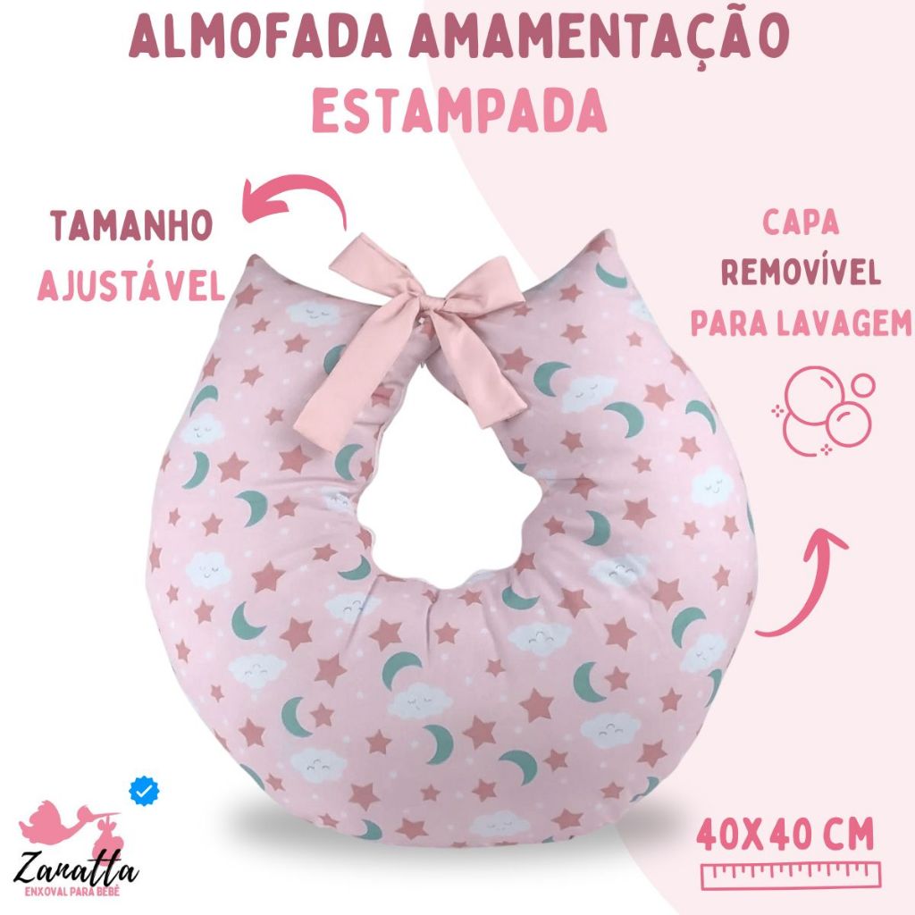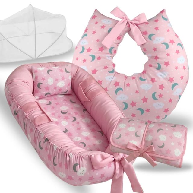 Ninho Redutor de Berço Almofada Para Amamentação Trocador Mosquiteiro Kit 4 Peças Enxoval Bebe Rosa