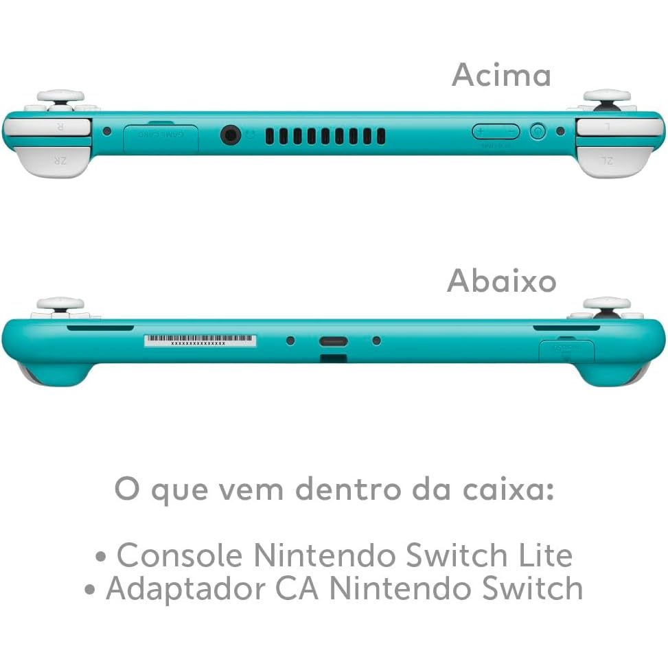 Console Nintendo Switch Lite 32GB TURQUESA Tela 5.5 Portatil Apresentamos o nintendo switch lite, uma nova versão do console nintendo switch que foi otimizado para o jogo pessoal e portátil, o nintendo switch lite é um console nintendo switch leve e pequeno, a um ótimo preço, com um botão direcional embutido e um design elegante em um único elemento, nintendo switch lite é perfeito para jogar em qualquer lugar e é compatível com jogos populares como super mario odyssey, mario kart 8 deluxe, super smash bros, ultimate, the legend of zelda: breath of the wild e muito mais, se você está em busca um console só seu, nintendo switch lite está pronto para lhe acompanhar aonde você for. Características: - Marca: nintendo - Modelo: hbhsbbza2 Especificações: - cor: TURQUESA - tela: lcd touch screen 5,5 polegadas - resolução: 1280 x 720 - bateria: 1 bateria de ions de lítio embutida no aparelho - capacidade da bateria: 3570mah - cpu: processador nvidia tegra personalizado - armazenamento: 32gb interno (expansivel até 2tb) - conexões: wi- fi/ bluetooth 4.1 / nfc (comunicação de campo próximo) - conector usb: usb type- c (usado apenas para carregamento). - conector de fone: estéreo de 4 polos de 3,5 mm (padrão ctia) - sensor: acelerômetro / giroscópio - duração da bateria: apróx. 3 a 7 horas - tempo de carga: aproximadamente 3 horas. Dimensões (axlxc): - 11 x 22 x 9 cm peso: 700g Conteúdo da embalagem: - Console Nintendo Switch Lite 32GB TURQUESA Tela 5.5 Portatil Garantia do Fornecedor 12 meses Garantia: 1 ano de garantia (3 meses de garantia legal + 9 meses de garantia contratual junto ao fabricante) Peso: 700 gramas (bruto com embalagem) Estamos à disposição para esclarecer qualquer dúvida. Atenciosamente, Equipe NegociuN!
