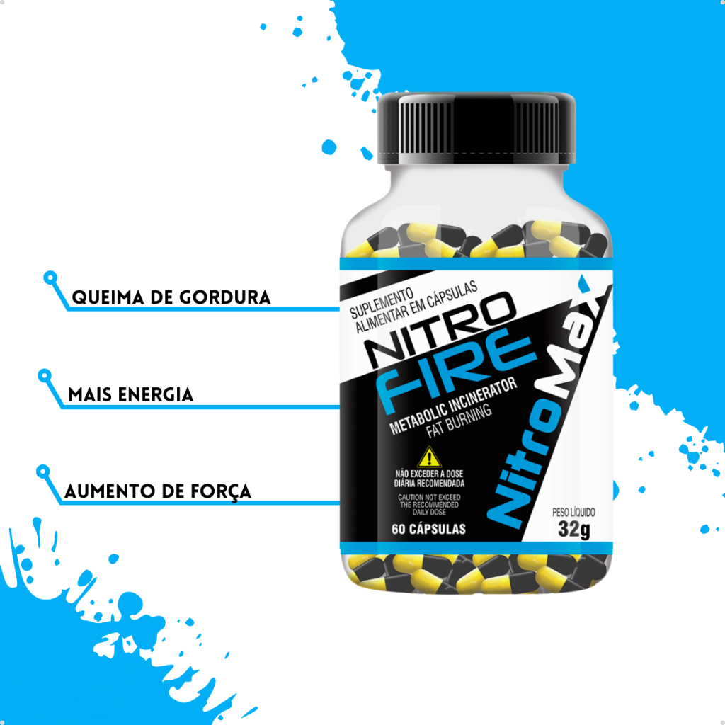 Nitro Fire vai otimizar seus resultados. Use 30 a 40 minutos antes do treino e aumente sua força e a queima de gordura. Nitro Fire produz um efeito termogênico que acelera o metabolismo, produzindo mais energia e favorecendo a queima calórica, contribuindo para perda de lipídeos. Ingerir uma cápsula ao dia, de preferencia 30 a 40 minutos antes da atividade física. Cafeína, riboflavina, excipiente q.s.p estearato de magnésio. Conservar ao abrigo dos raios solares e mantenha em local fresco e seco. Após aberto consumir em até 30 dias. Não consumir este produto, caso o lacre de segurança esteja violado.