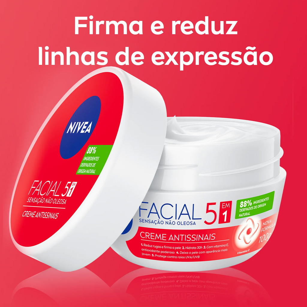Nivea Antissinais - Firmeza, Hidratação e Prevenção de Rugas Ideal para todos os tipos de pele, até as oleosas. Oferece alta proteção facial com ação antienvelhecimento, com textura leve e toque seco, controla o brilho, previne rugas e manchas causadas pelo sol. Garante conforto e rápida absorção, perfeito para uso diário e antes da maquiagem. Conselho de Aplicação Aplique o creme no rosto, pescoço e colo limpos com delicados movimentos de massagem até completa absorção. Pode ser usado de manhã e à noite.