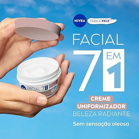 O que é o Hidratante Facial NIVEA Pele Negra Beleza Radiante 7 em 1 100g? O Hidratante Facial NIVEA Pele Negra Beleza Radiante 7 em 1 é um creme hidratante desenvolvido especialmente para atender às necessidades únicas da pele negra. Com uma fórmula enriquecida com ativos como Ácido Hialurônico, Extrato de Pérolas e Cúrcuma, este produto oferece cuidado completo para a pele, promovendo hidratação, luminosidade e uniformidade. Sua textura leve e de rápida absorção torna-o perfeito para o uso diário.Conteúdo da embalagem: 100gFabricado por: NÍVEA Composição do Hidratante Facial NIVEA Pele Negra Beleza Radiante 7 em 1: Ácido Hialurônico: Hidrata profundamente a pele, ajudando a reduzir linhas finas.Extrato de Pérolas: Proporciona luminosidade e uniformiza o tom da pele.Cúrcuma: Possui propriedades antioxidantes e calmantes, ajudando a controlar a oleosidade. Para que serve o Hidratante Facial NIVEA Pele Negra Beleza Radiante 7 em 1? O Hidratante Facial NIVEA Pele Negra Beleza Radiante 7 em 1 serve para proporcionar cuidados completos à pele negra. Ele controla a oleosidade, promove um efeito matte duradouro, reduz marcas escurecidas, uniformiza o tom da pele e oferece proteção contra os raios UVA/UVB. Além disso, hidrata e ilumina, deixando a pele radiante e saudável. Benefícios do Hidratante Facial NIVEA Pele Negra Beleza Radiante 7 em 1: Controla a oleosidade e promove um efeito matte. Uniformiza o tom de pele, reduzindo marcas escurecidas. Oferece proteção UVA/UVB contra os danos solares. Proporciona hidratação intensa e luminosidade natural. Textura leve e de rápida absorção, ideal para o uso diário. Desenvolvido especialmente para as necessidades da pele negra. Como usar o Hidratante Facial NIVEA Pele Negra Beleza Radiante 7 em 1? Com a pele limpa e seca, aplique uma quantidade adequada do Hidratante Facial NIVEA Pele Negra Beleza Radiante 7 em 1 no rosto e no pescoço. Espalhe suavemente com movimentos circulares até a completa absorção. Use diariamente pela manhã e à noite para melhores resultados. Advertências: Uso externo. Evite contato direto com os olhos. Em caso de irritação, suspenda o uso e consulte um dermatologista. Mantenha fora do alcance de crianças. Armazene em local fresco e protegido da luz direta.
