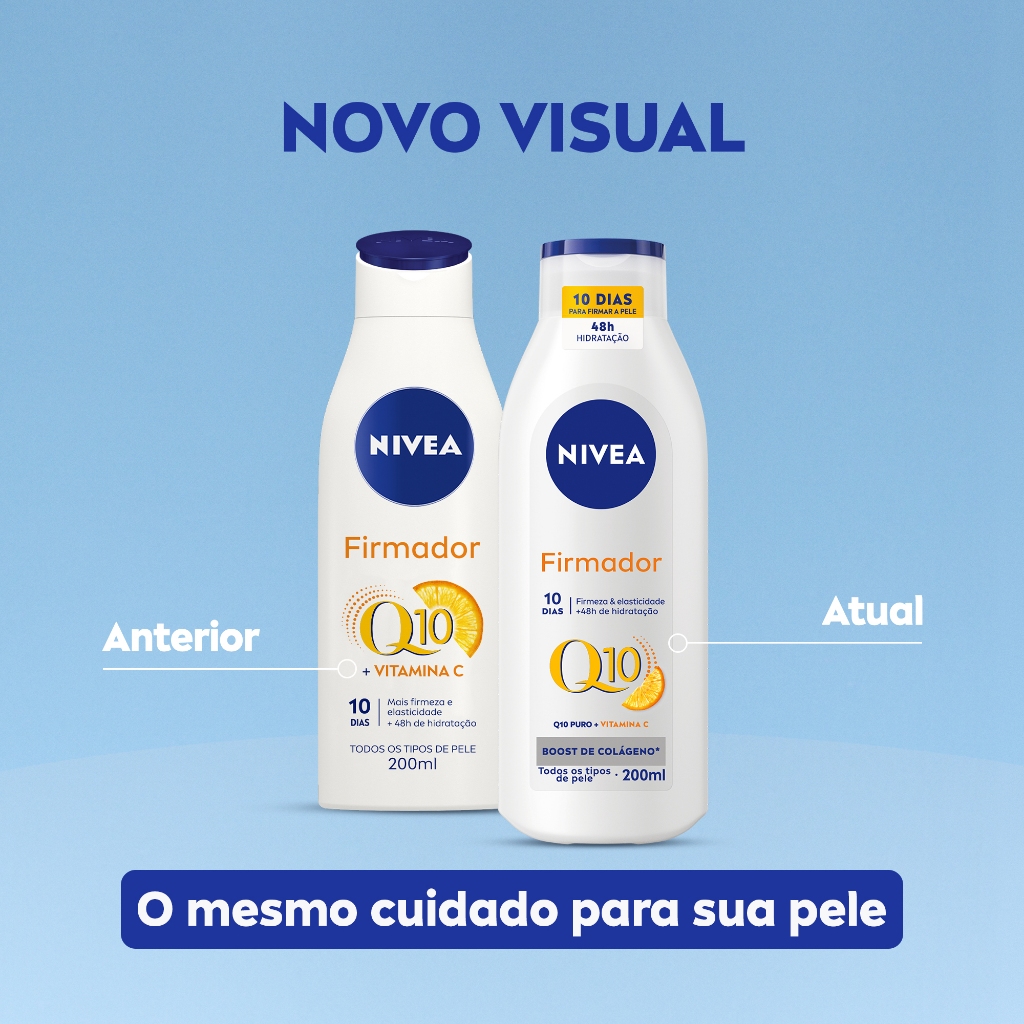 O que é? NIVEA Loção Hidratante Firmador Q10 + Vitamina C é um hidratante corporal que proporciona firmeza e elasticidade à pele. Com ação hidratante por até 48 horas, sua fórmula agradável é ideal para pele seca e extrasseca. *com uso regular Para que serve? Sua fórmula exclusiva estimula a produção de colágeno*, contendo Q10 Puro + Vitamina C. Ela firma visivelmente e melhora a elasticidade da pele em 10 dias. *Teste in-vitro Benefícios e diferenciais: - Hidratação por 48 horas - Mais firmeza e elasticidade - Q10 puro e Vitamina C - Ideal para pele seca e extrasseca - Estimula produção de colágeno* - Dermatologicamente testado *Teste in-vitro "