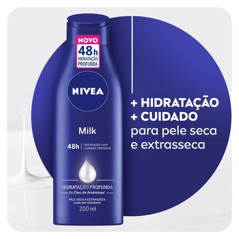 Loção Hidratante NIVEA Milk Hidratação Profunda 200ml - 3 unidades O que é? NIVEA Loção Hidratante Milk Pele Seca a Extrasseca é um produto desenvolvido para hidratar profundamente a pele, proporcionando um cuidado intensivo. Para que serve? Sua textura cremosa e suave oferece uma agradável sensação de maciez, cuidando e protegendo a pele do ressecamento. NIVEA Loção Hidratante Milk Pele Seca a Extrasseca possui uma fórmula enriquecida com duas vezes mais óleo de amêndoas, nutre intensamente por até 48 horas. Indicado especialmente para peles secas e extrassecas, este hidratante corporal é livre de corantes, sem álcool etílico e não contém ingredientes de origem animal. Denso e com a clássica fragrância de NIVEA, deixa a pele visivelmente mais saudável e bonita. Benefícios e diferenciais: - 2x mais óleo de amêndoas - 48 horas de hidratação profunda - 0% corantes e álcool etílico - Livre de ingredientes de origem animal - Contém vitamina E