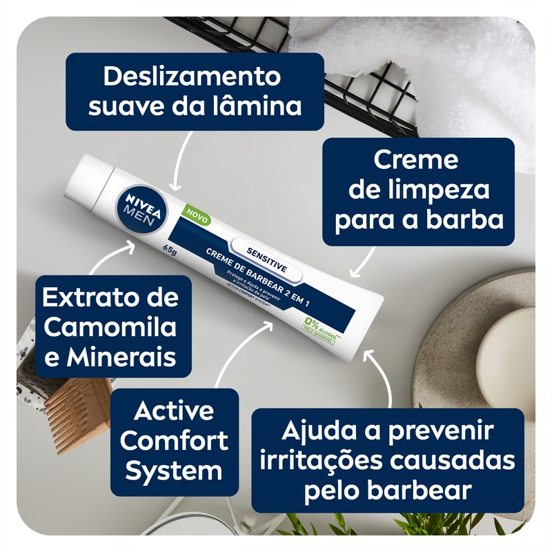 O que é? NIVEA MEN Creme de Barbear Sensitive 2 em 1 é um produto desenvolvido especialmente para proporcionar um barbear suave e confortável. Para que serve? Feito para facilitar o deslizar da lâmina, o creme garante um barbear rente e confortável. Além disso, contém tecnologia hidratante especial da NIVEA, enriquecida com minerais marinhos e Vitamina E, que protegem e hidratam a pele durante e após o barbear. Indicado para peles sensíveis e dermatologicamente testado, NIVEA MEN Creme de Barbear Sensitive 2 em 1 é perfeito para quem busca um barbear de qualidade, com proteção e cuidado para a pele. Experimente e desfrute de um barbear impecável e uma pele hidratada. Benefícios e diferenciais - Protege e hidrata a pele durante e após o barbear - Deslize suave da lâmina - Textura em creme - Ideal para peles sensíveis - Dermatologicamente testado