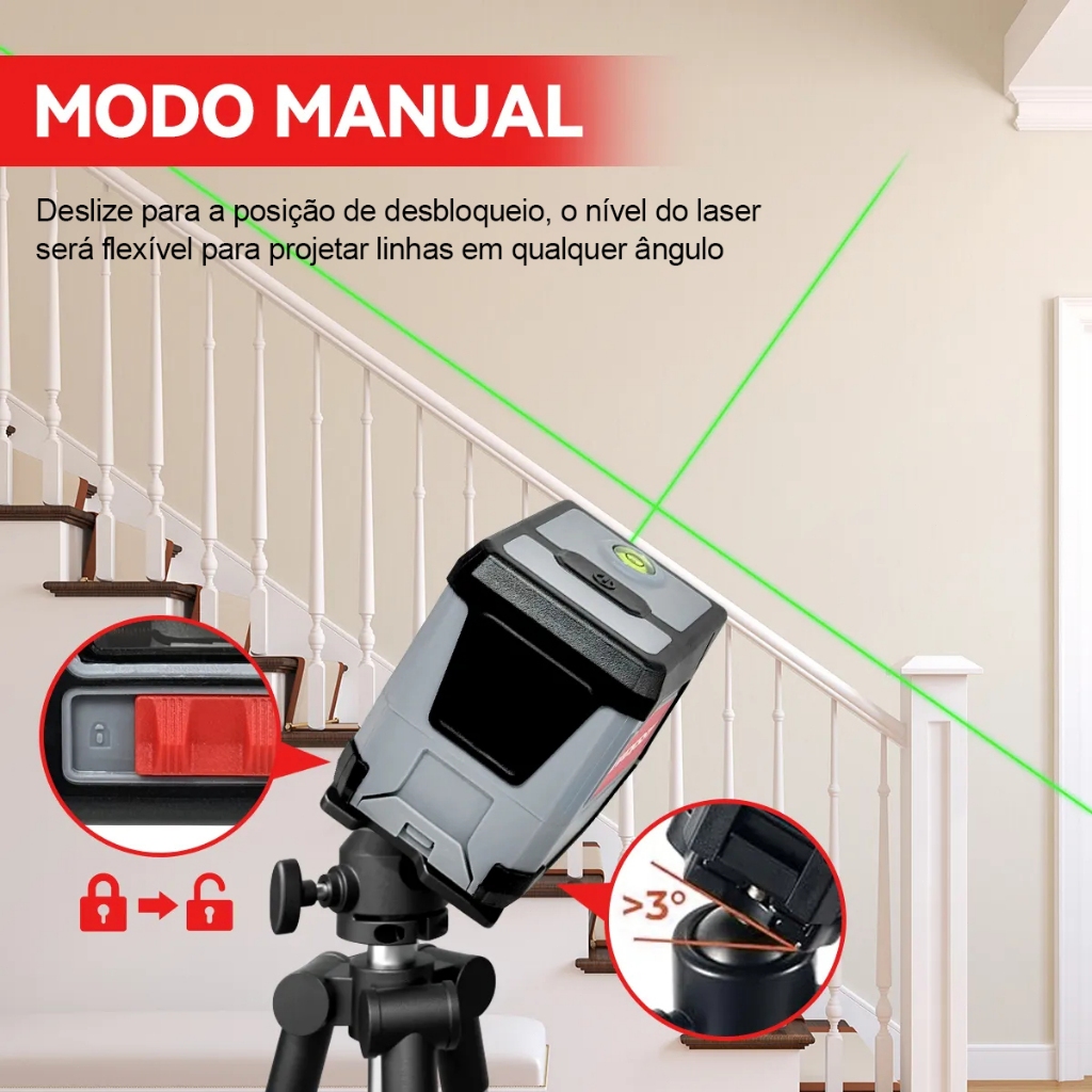 Ruomu Nivel Laser 2 Linhas Verde, equipado com diodo laser Osram importado da Alemanha, projeta linhas laser verdes puras mais nítidas, estáveis e brilhantes, sem difusão de pontos de luz. Inclui tripé para adaptação a múltiplos ângulos de trabalho. Nivel Lase Funcionalidades Principais - Com tripé: Ajuste a altura da haste telescópica para atender diferentes necessidades de medição - Sistema de pêndulo inteligente: Nivela automaticamente dentro de ±3°,pisca quando inclinado além do limite - Modo Manual: Permite uso em qualquer ângulo para necessidades de construção específicas - Medição Precisa: Erro quase zero, garantindo precisão em projetos pequenos e médios - IP54 à Prova d'Água e Poeira: Carcaça de alta qualidade protege contra quedas, poeira e água, prolongando a vida útil - Alcance Efetivo de 20m: Ideal para instalações e reformas a distância Nivel Lase Especificações Do Produto - Modelo: 2 linhas - Classe do laser: Classe II - Comprimento de onda: 535 nm - Fonte de energia: 2 pilhas AA - Distância de trabalho: Até 20 metros - Proteção: IP54 (à prova de poeira e respingos) - Precisão horizontal/vertical: ±1mm/10m - Auto-nivelamento:±3° - Dimensões: 75×55×70mm - Rosca do suporte: 1/4 polegada UNC Nivel Lase Conteúdo Da Embalagem - 1 × Nivel Laser de 2 linhas - 2 × Pilhas AA - 1 × Suporte em L - 1 × Bolsa de transporte - 1 × Manual do usuário - 1 × tripé Acessórios Inclusos para Praticidade Total: * Tripé estável para fixação sem vibrações * Bateria inclusa para uso imediato * Bolsa de transporte para levar com facilidade Adquira já o Nível Laser RUOMU e transforme sua maneira de construir — com precisão, praticidade e confiança!