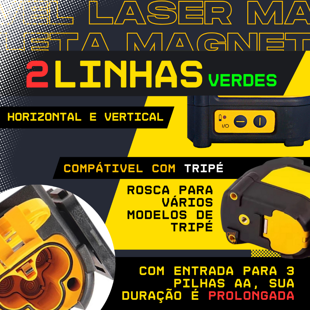 ATENÇÃO: COLOCAR AS PILHAS NA POSIÇÃO CORRETA. ATRÁS DA TAMPA TEM A ILUSTRAÇÃO. PARA LIGAR O APARELHO, É NECESSÁRIO SEGURAR O PRIMEIRO BOTÃO POR ALGUNS SEGUNDOS Características Gerais do Características: O nível a laser automático possui uma faixa de trabalho de 50 metros, permitindo que você trabalhe mais rápido e fácil ao instalar pisos, azulejos, tetos e divisórias. Ideal para todos os serviços que exigem alta precisão ao usar instrumentos de medição. Seu revestimento é totalmente emborrachado para maior durabilidade no trabalho e proteção em caso de queda! Ainda por razões de segurança para evitar que as ferramentas caiam, foi desenvolvido uma óptica que flutua livremente dentro da carcaça e só é fixada magnéticamente, mantendo 100% de proteção. Ideal para aplicações internas e externas. A sua precisão de 3 mm por 10 metros garante 100% maior precisão do que as ferramentas convencionais. Possui base magnética que fixa facilmente em diferentes materiais, permitindo 360° Operação. A montagem de parede universal permite que você trabalhe em madeira e metal e permite que o laser se mova para cima e para baixo para trabalhar em pontos predefinidos. Funciona com 3 pilhas "AA" e a caixa da bateria é totalmente selada para evitar que poeira e sujeira entrem na fonte de alimentação. Ações e indicadores O funcionamento fácil através de 2 botões: um ativa a linha vertical do nível a laser e o outro ativa a linha horizontal da + forma; Alargamento irregular: A luz pisca para indicar irregularidade; A visibilidade de até 50m; Luz indicadora de bateria fraca: A luz pisca quando a bateria está baixa; O nivelamento a Laser: nivelamento de linha a Laser leva apenas 2 segundos; Especificações Técnicas: Faixa visual interna: 50 metros Fonte de alimentação: 3 pilhas AA Precisão: 3 mm em 10m