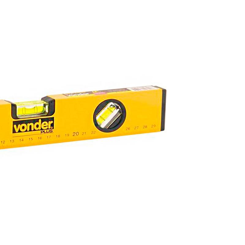 Nível de Alumínio 30cm 12 POL Base Magnética 3535100120 VONDERNível de alumínio é indicado para nivelar superfícies em geral, possui corpo em alumínio, conferindo maior leveza, 3 bolhas, sendo uma para nivelamento vertical, uma para nivelamento horizontal e uma para nivelamento 45°, além de base magnética que facilita o trabalho de nivelamento em estruturas metálicas, permitindo a fixação através do ímã.Conta ainda com escala de medida na base, de um lado em centímetros e milímetros e do outro em polegadas.DADOS TÉCNICOS:Comprimento: 12 POL.Posição das bolhas: 1 vertical, 1 horizontal e 1 inclinada 45°.Ref: 31143Marca: VONDERGarantia: 90 dias*Imagens meramente ilustrativas.